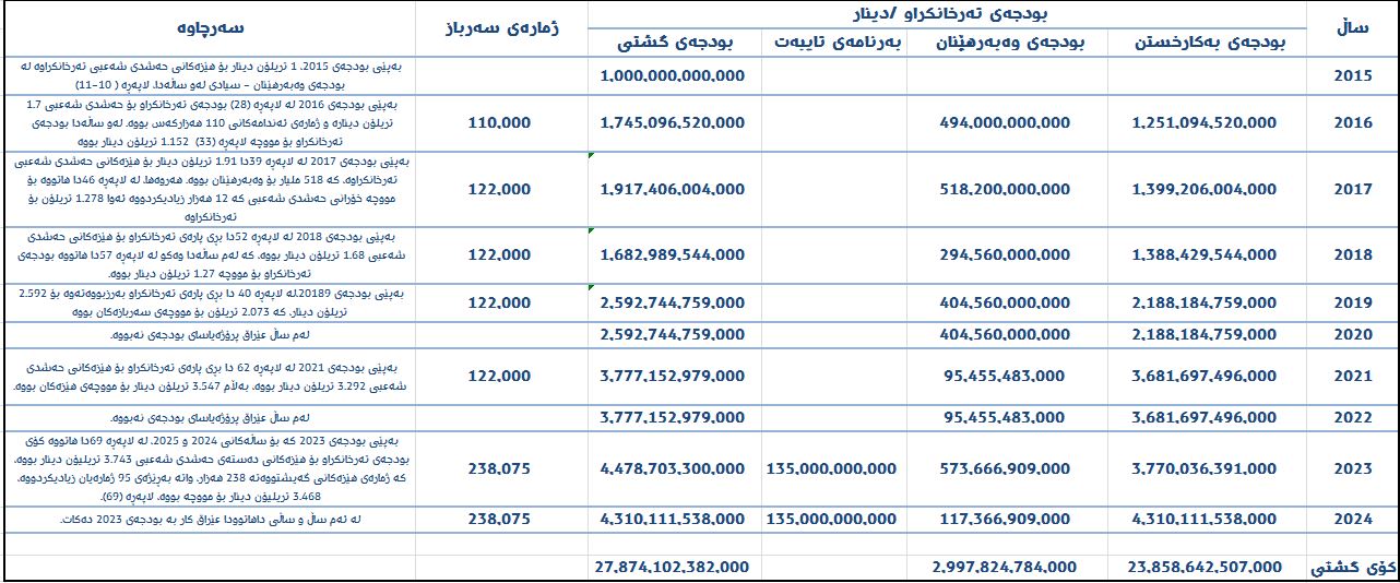 تێبینی1: ساڵی 2020 و 2022 عێراق بودجەی گشتی ساڵانەی نەبووە، لەم شیکارییەدا وادانراوە کە ژمارەی هێزەکان و بڕی پارەی تەرخانکراو وەک ساڵی پێش خۆی بووبێت.