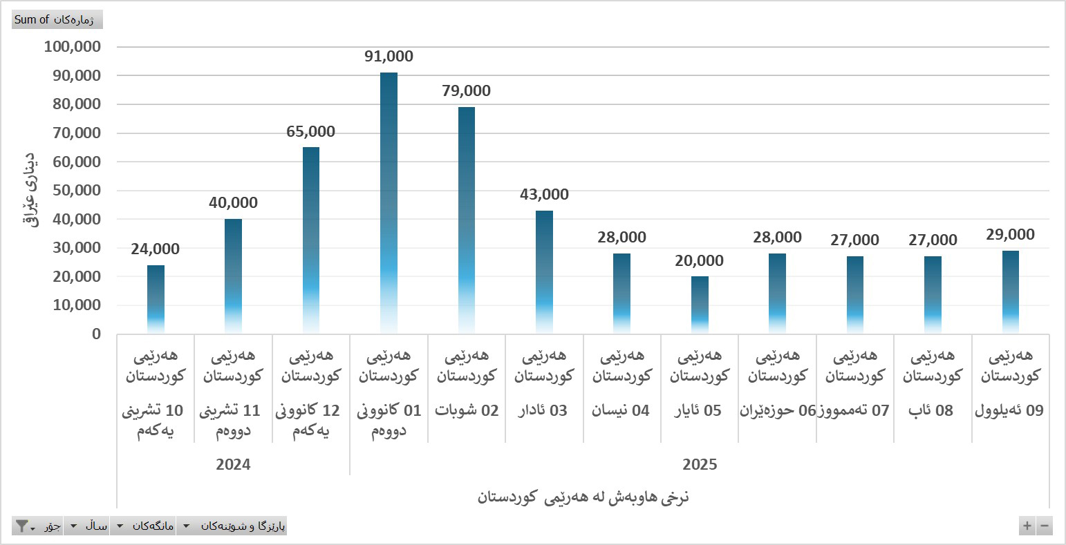 بەپێی داتاکانی پرۆژەکە، لەرووی نرخەوە بەشێوەیەکە کە نرخی گەڕاوە یان بەهای پارەکە دەکەوێتەسەر بەکارهێنانی کارەبا. بڕەکەش لە مانگەکانی ساڵ جیاوازە و، بەرزترینی لەمانگی کانوونی دووەمی 2025 بووە گەشتووەتە 91 هەزار دینار و نزمترین لە ئایار ئەمساڵدایە کەوا 20 هەزار دینارە وەکو لە گرافیکی خوارەوەدا هاتووە.