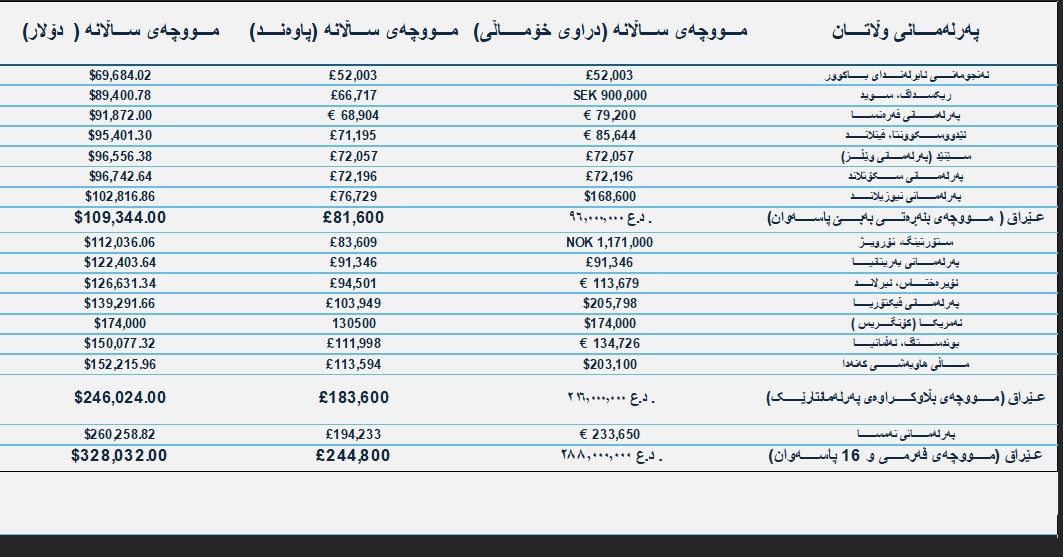 - داتاکانی "عێراق مووچەی پەرلەمانتارێک لەسەر بنەمای بڵاوکراوەی پەرلەمانتاری کۆمەڵی دادگەری لەم خوولەی ئێستا پەرلەمان وەرگیراوە.