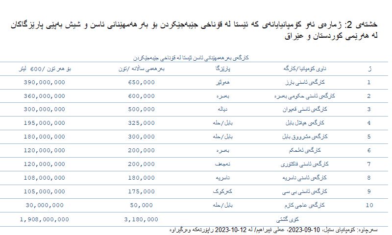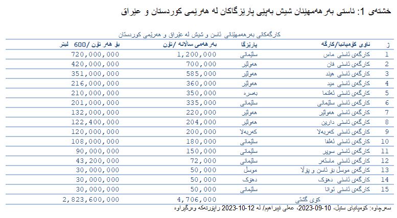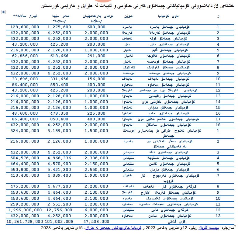 ئەگەر ئەم کۆمپانیایانە بەتوانای تەواوەتی خۆیانەوە کاربکەن، ساڵانە 101 ملیۆن مەتر سێجا یان 101.26 ملیار لیتر ئاویان بۆ بەرهەمهێنانی ئەو بڕە پێویستە کە ساڵانە بەرهەمیدەهێنن. بەڕوویەکی دیکەدا، ئەگەر بەتەنیا ئەو بڕەی کۆمپانیا تایبەتەکان ساڵانە بەرهەمیدەهێنن لێکبدەینەوە، ئەوا بۆ هەر تۆنێک چیمەنتۆ 2.126 مەتر سێجا یاخود 2126 لیتر ئاوی پێویستە، واتە 61 ملیۆن مەتر سێجا یان 61 ملیار لیتر ئاو!