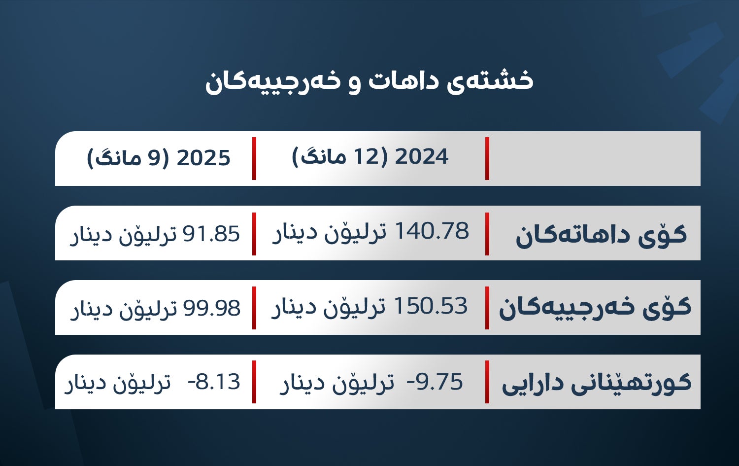 خەرجیی وەبەرهێنان (پڕۆژەکان): لە ساڵی 2024 دا تەنیا 6.37 ترلیۆن دینار و لە 9 مانگی 2025 دا تەنیا 4.20 ترلیۆن دینار بووە.