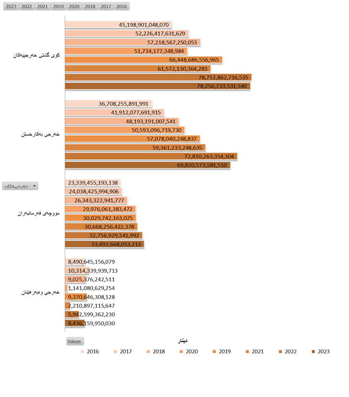 خاڵیکی دیکەی سەرنجڕاکیش جیاوازییەکانی ئەمساڵ و ساڵی رابردووە لە نۆ مانگی یەکەمدا، سەرەڕای کەمبوونەوەی داهات، کەچی خەرجییەکان وەک یەک بووە. بۆ نموونە لە 2022دا کاتێک کۆی گشتی داهات سەرووی 122 تریلیۆن دینارە، خەرجییەکان 78.75 تریلیۆن دینارە، ئەمساڵ کۆی گشتیی داهات بۆ 95.8 تریلیۆن دینار دابەزیوە، کەچی کۆی گشتی خەرجییەکان هەر 78.25 تریلیۆن دینار بووە.