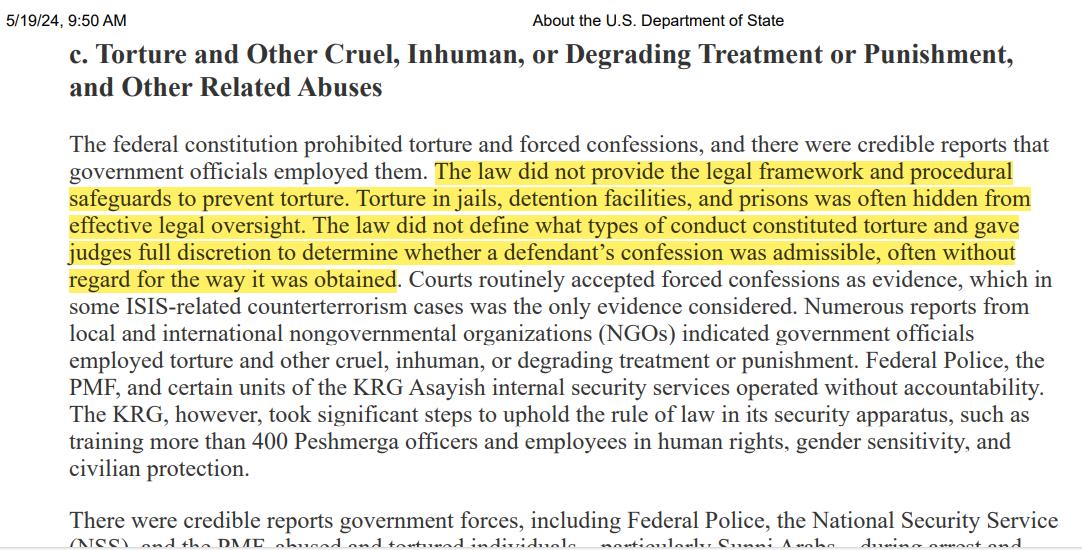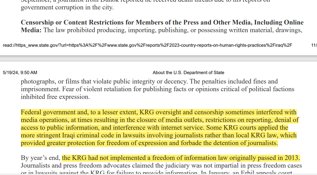 ههر لهراپۆرتهكهدا هاتووه: "لهههرێمی كوردستان، بۆ سزادانی تۆمهتبارانی بواری چالاكی مهدهنی، زیاتر یاسای سزادانی فیدراڵییهكان بهكاردێنن، نهك یاساكانی ههرێم كه زێدهتر میدیاكار و چالاكی مهدهنی دهپارێزێت".