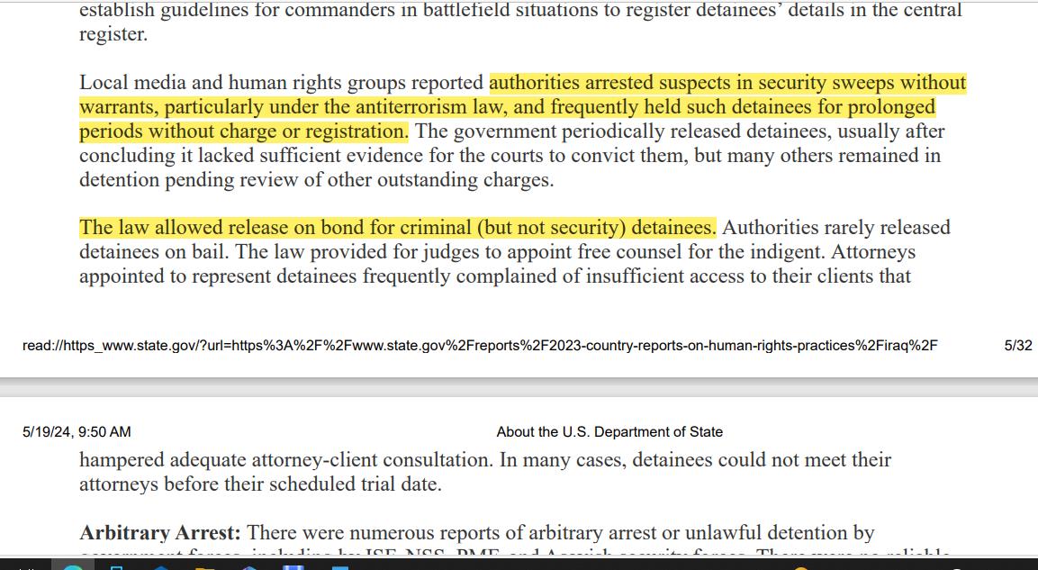 ئهگهر لهبهشی یهكهمی راپۆرتهكه دهست پێبكهین، كه تایبهته به رێزگرتن له نهزاههتی تاك، ئهوا له راپۆرتهكهدا به چهند خاڵێك چهند كێشهیهكی جیدی پهیوهست به سیستمی گرتن و زیندانیكردن و كاری دادگاكان خستووەتهڕوو لهسهر ئاستی فیدراڵ و ههرێمی کوردستاندا. بهتایبهت له پرسی گرتنی هاووڵاتیان بهبێ ههبوونی فهرمانی دادوهری. یاخود گرتن و هێشتنهوهی زیندانی بۆ ماوهیهكی زۆر و دواخستنی دادگاییكردنیان و دهسگیركردنیان بهبێ هیچ روونكردنهوهیهكی یاسایی وتاوانی. كه دهكرێت ئهمه ببێته بنچینهیهك بۆكارنامهی داهاتووی ئهنجوومهنی دادوهری عێراق و ههرێمی کوردستان، كه بۆچی پێشێلكردنی زهقی لهمجۆره ههبێت؟