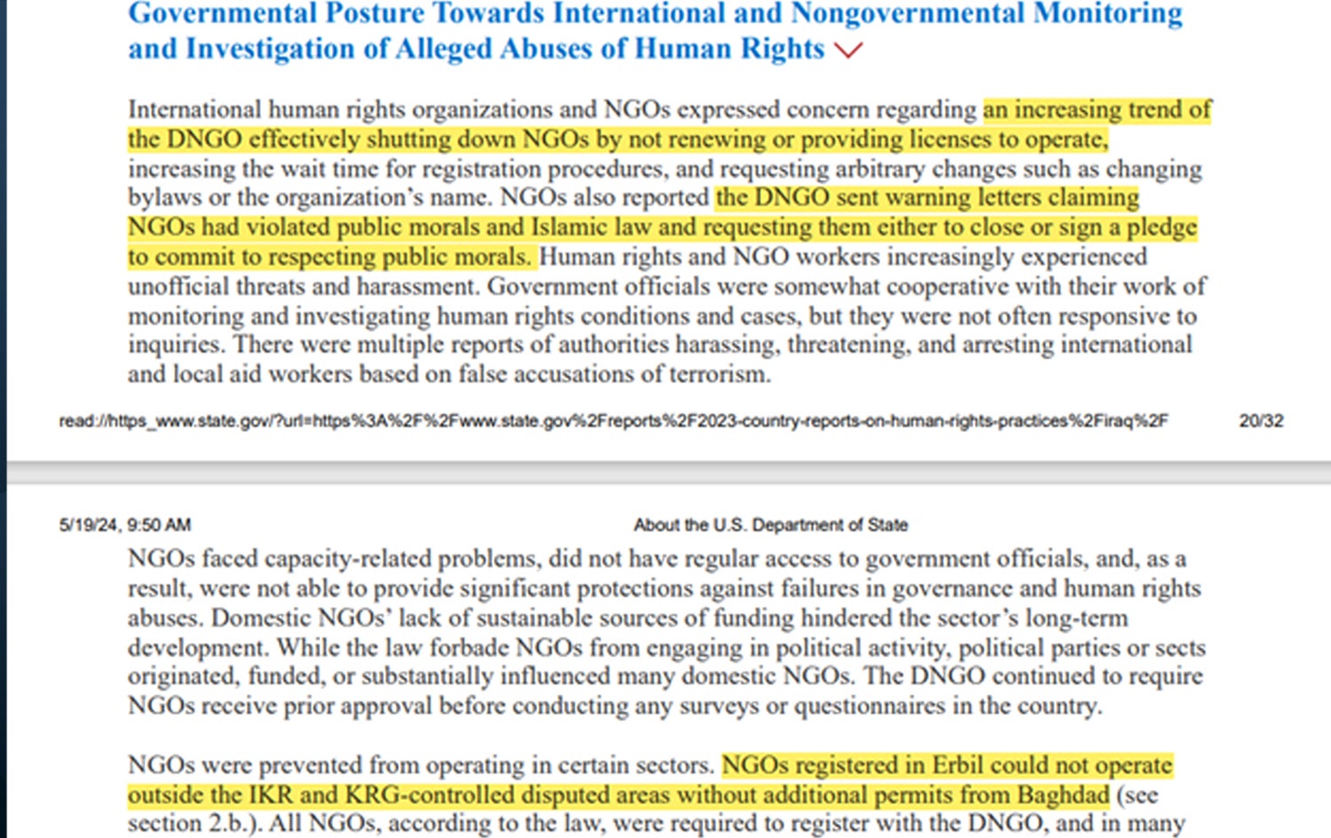 خاڵێكی دیكه كه بووەته جێی سهرنج و تێڕامانی راپۆرتهكهی پراكتیزهكردنی مافهكانی مرۆڤ، ئهویش دروستكردنی لهمپهر و بهربهسته لهبهردهم كاری رێكخراوه ناحكومییهكان لهسهر ههردوو ئاستی فیدراڵی و ههرێمی کوردستاندا. لهراپۆرتهكهدا هاتووه كه "رێكخراو ههیه بۆ پێدانی مۆڵهت و پهسندكردنی ناوهكهی 6 مانگی خایاندووه له بهغدا".