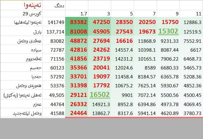 بەپێی سیستمی سانتلیگۆ بۆ هەژمارکردنی دەنگەکان، نرخی دوایین کورسی 15,313 دەنگ بوو، کە کورسیی دووەمی یەکێتی بوو، ئەمەش دوای دابەشکردنی ئەنجامی بەرایی کۆی دەنگی یەکێتی (45,939) بەسەر ژمارە 3دا. لە کاتێکدا بەهای کورسیی پێنجەمی پارتی کە کۆی دەنگی پارتی لە دەنگدانی گشتیدا (127,938) دابەشی 9 کرابوو، 14,215 دەنگ بوو. بەمەش بەهای کورسییەکەی یەکێتی لە بەهای کورسییەکەی پارتی بە (1,098) دەنگ زیاترە.