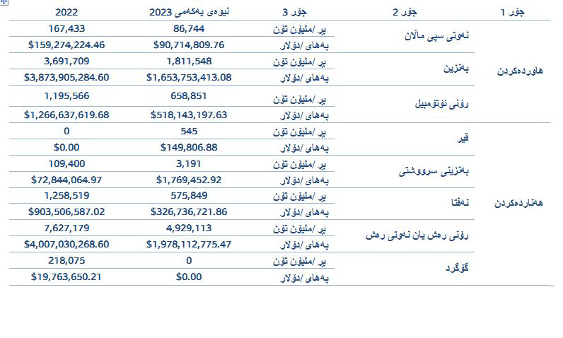 لەسەر ئاستی عێراق و بەپێی داتا بڵاوکراوەکانی کۆمپانیای سۆمۆ، لەماوەی نیوەی یەکەمی 2023دا عێراق بە بەهای 2.26 ملیار دۆلار سێ جۆری بەرهەمی نەوتی هاوردەکردووە، کە نەوتی سپیی ماڵان بە بەهای 90.7 ملیۆن دۆلار، رۆنی ئۆتۆمبیل بە بەهای 518 ملیۆن دۆلار و بەنزین بە بەهای 1.65 ملیار دۆلار بووە و، لەهەمان ماوەدا بە بەهای 2.3 ملیار دۆلار بەرهەمەکانی نەوتیش هەناردەکراون.