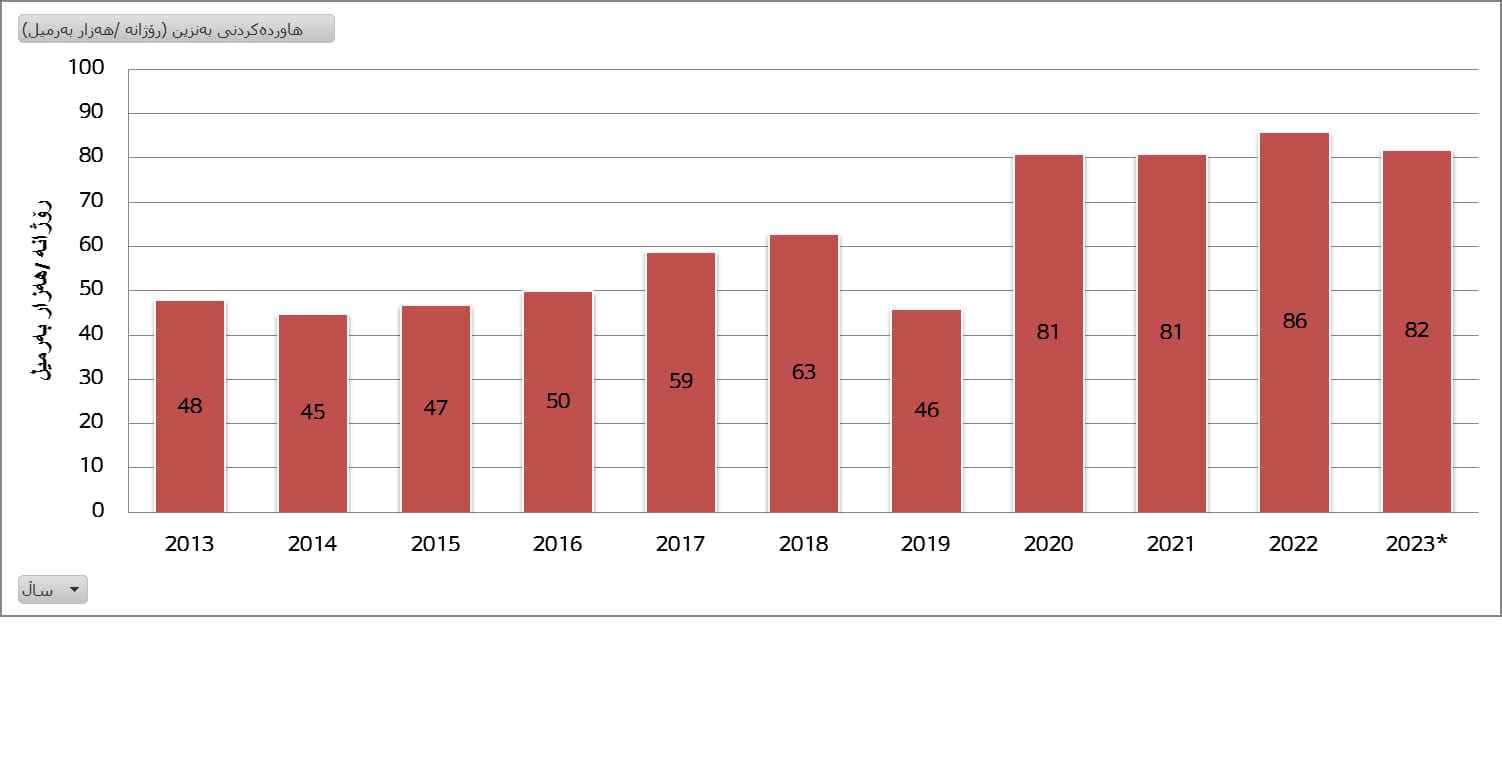 بەپێی داتاکانی میس و دەستپێشخەری داتای رێکخراوە هاوبەشەکان JODI لەماوەی دەیەی رابردوودا بەنزیکەی هاوردەکردنی بەنزین لە دەرەوە بۆ نێوخۆی عێراق دوو هێندە زیادیکردووە، بەشێوەیەک لە 2013دا رۆژانە 48 هەزار بەرمیل هاوردەکراوە و ئەوەش لە 2022دا گەیشتووەتە 86 هەزار بەرمیل و لە هەشت مانگی ئەمساڵیشدا 82 هەزار بەرمیلی رۆژانە بووە.