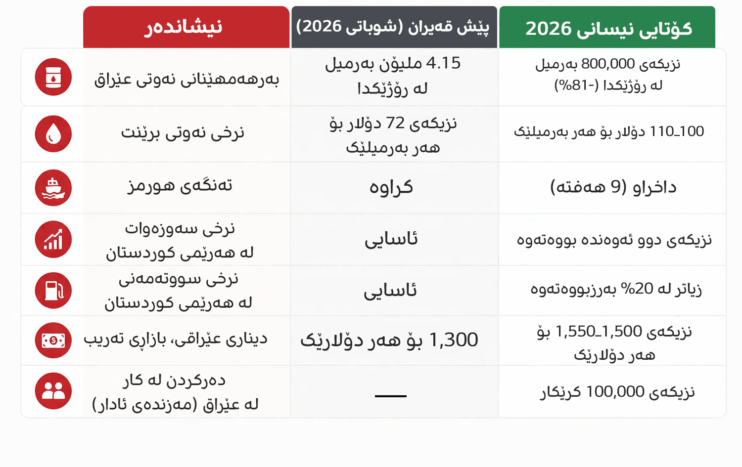 بەرهەمهێنانی نەوتی عێراق بە رێژەی 81% دابەزیوە لەوکاتەوەی تەنگەی هورمز لە 28ـی شوبات دا داخراوە، لە مانگی ئاداردا حکومەتی عێراق تەنیا توانیویەتی 27%ـی تێچووی مانگانەی مووچە و خانەنشینی دابین بکات. بۆ زیاتر لە 10 ملیۆن عێراقی کە پشت بە مووچەی حکومەت یان خانەنشینی دەبەستن، ئەو کورتهێنانە تەنیا ژمارە نییە، بەڵکو کێشەیەکی راستەقینەیە.