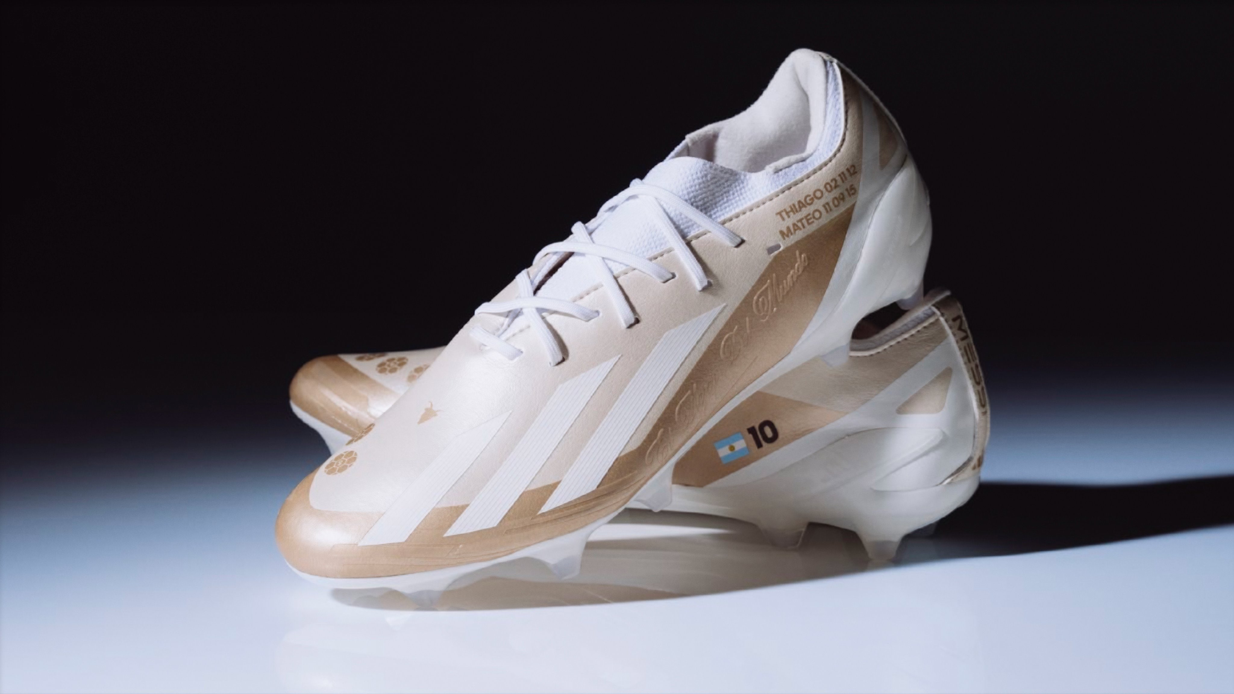 پێڵاوە نوێیەکەی مێسی، ناوی خۆی، ئانتۆنێلای هاوژینی و هەموو منداڵەکانی لەسەرە، لەگەڵ بەرواری لە دایکبوونی منداڵەکانی و ژمارە 10ـی لیۆ و ئاڵای ئەرجەنتین.