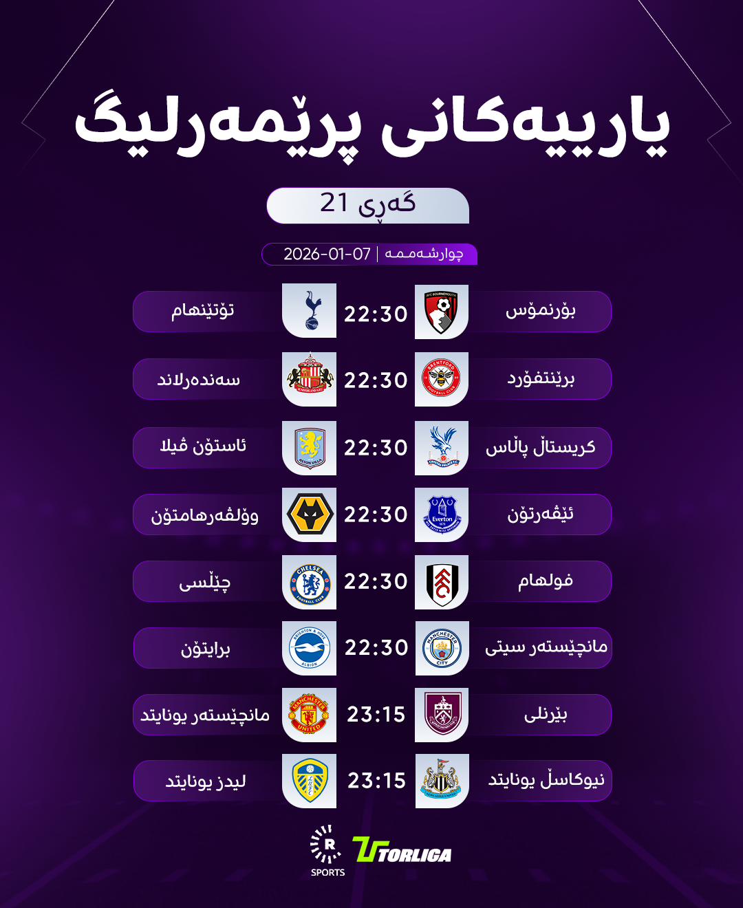 لە یارییەکی دیکەدا، کە دوایین یاریی ئەمشەوی پرێمەرلیگ دەبێت، هەردوو یانەی مانچێستەر یونایتد و بێرنلی رووبەڕووی یەکدەبنەوە.
