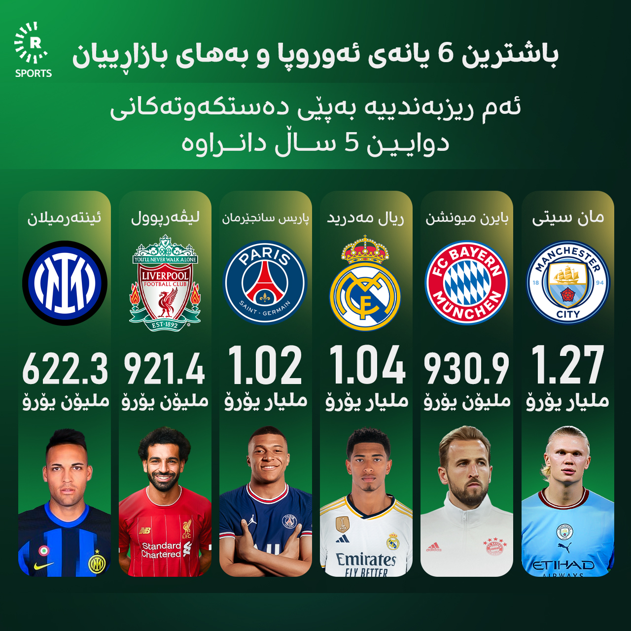 ئەمە ریزبەندیی باشترین 6 یانەی ئەوروپا و بەهای بازاڕییانە: