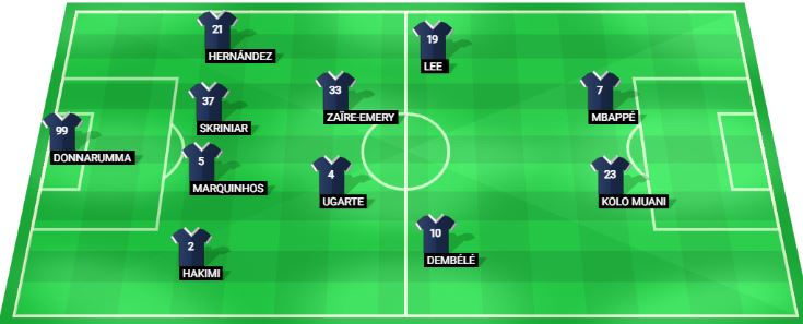 پاریس سانجێرمان: دۆنارۆما، حەکیمی، مارکینیۆس، شکرینیار، لوکاس هێرناندێز، ئوگارتێ، زایر ئێمری، دێمبێلێ، لی کانگ ئین، کۆلۆ موانی، ئێمباپێ.