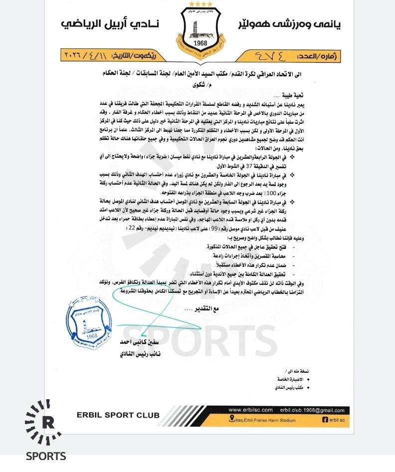 یانەی هەولێر بەنووسراوێکی فەرمی سکاڵای لەسەر چەند ناوبژیوانێک بۆ یەکێتیی تۆپی پێی عێراق بەرزکردووەتەوە، لە ئەگەری نەبوونی وەڵام یانەکە هەڕەشەی بەرزکردنەوەی سکاڵا بۆ دادگە وەرزشییە نێودەوڵەتییەکان دەکات.
