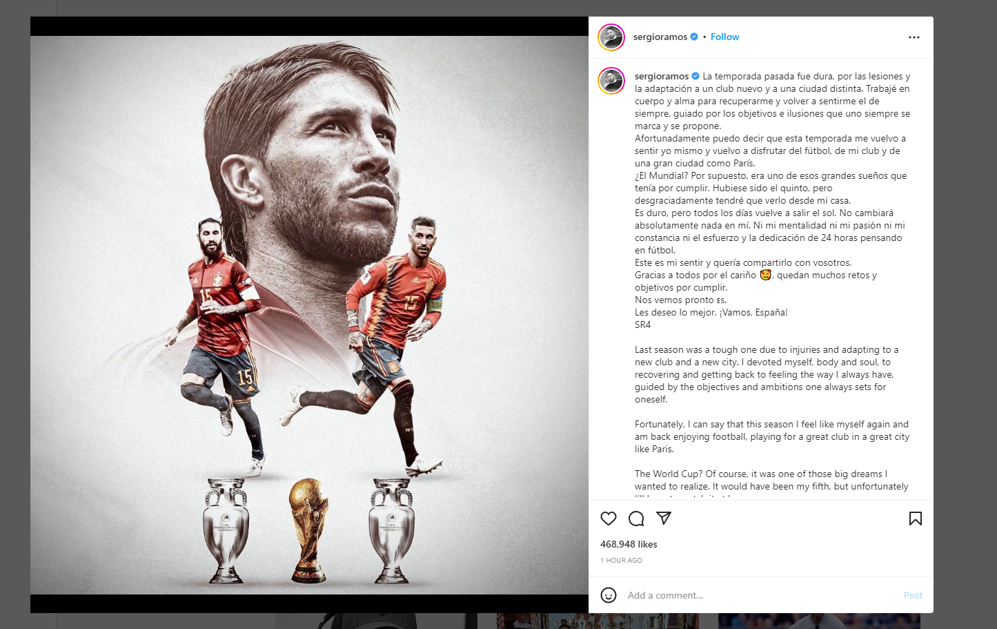 لە کۆتایی پەیامەکەیدا، سێرخیۆ رامۆس نووسیوویەتی " ئەمە هەستی منە و دەمەویست لەگەڵ هەمووتان بەشی بکەم، سوپاس بۆ پاڵپشتیتان، ئاڵنگاری و ئامانجی زۆر لە پێشە، بەمزووانە دەتانبینمەوە و هیوای باشترینتان بۆ دەخوازم، هەربژی ئیسپانیا."