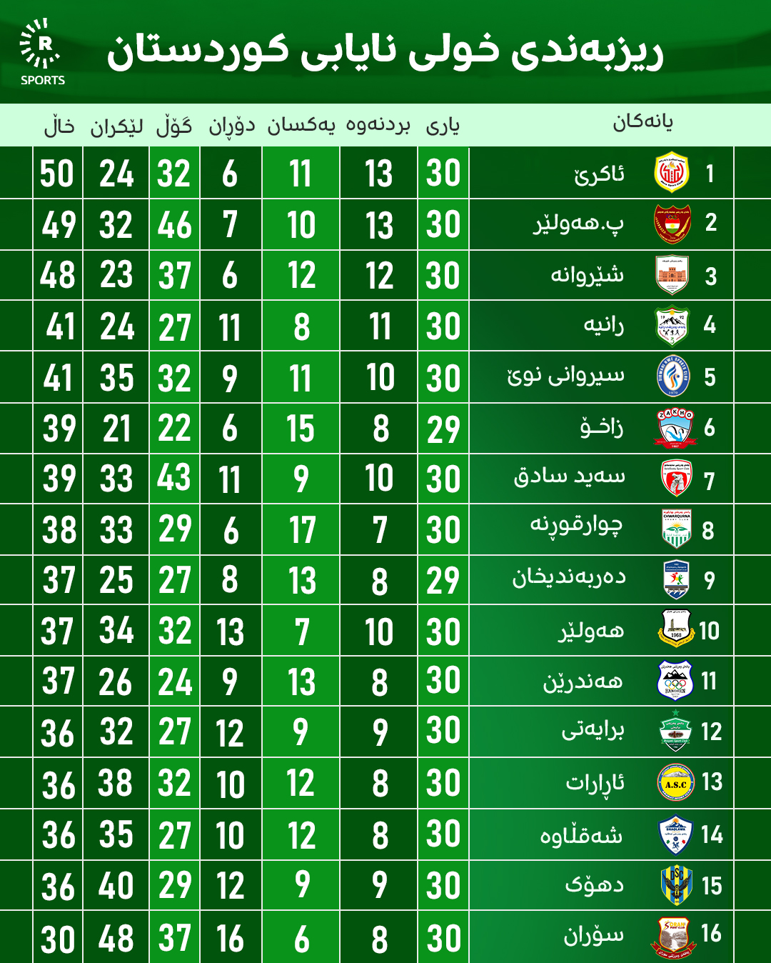 دهۆک 36 خاڵی کۆکردووەتەوە و یانەی برایەتی، ئارارت و شەقڵاوە هەمان ژمارەی خاڵیان هەبوو، بەڵام بە جیاوازی 3 گۆڵ پلەی دوانزدە و سیانزدە و چواردەمیان گرت و توانیان لە خولی نایابی کوردستان بمێننەوە. سۆرانیش تەنیا 30 خاڵی کۆکردە و و وەک دوا یانەی ریزبەندییەکە ماڵئاوایی لە خولی نایابی کوردستان کرد.