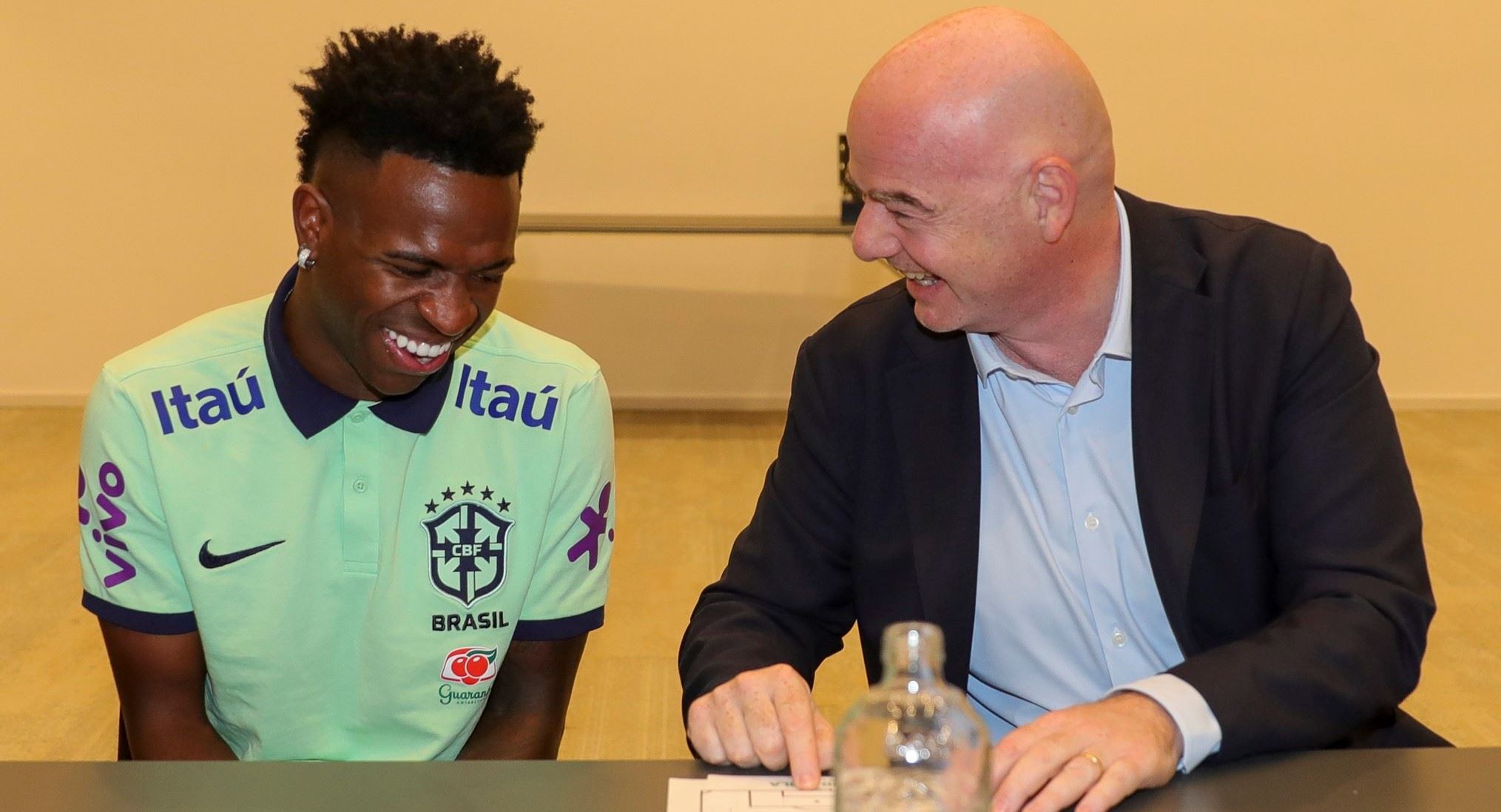 جیانی ئینفانتینۆ، سەرۆکی فیدراسیۆنی تۆپی پێی نێودەوڵەتی لەگەڵ ڤینیسیۆس جۆنیۆر، ئەستێرەی هەڵبژاردەی بەرازیل و یانەی ریال مەدریدی ئیسپانی کرد.