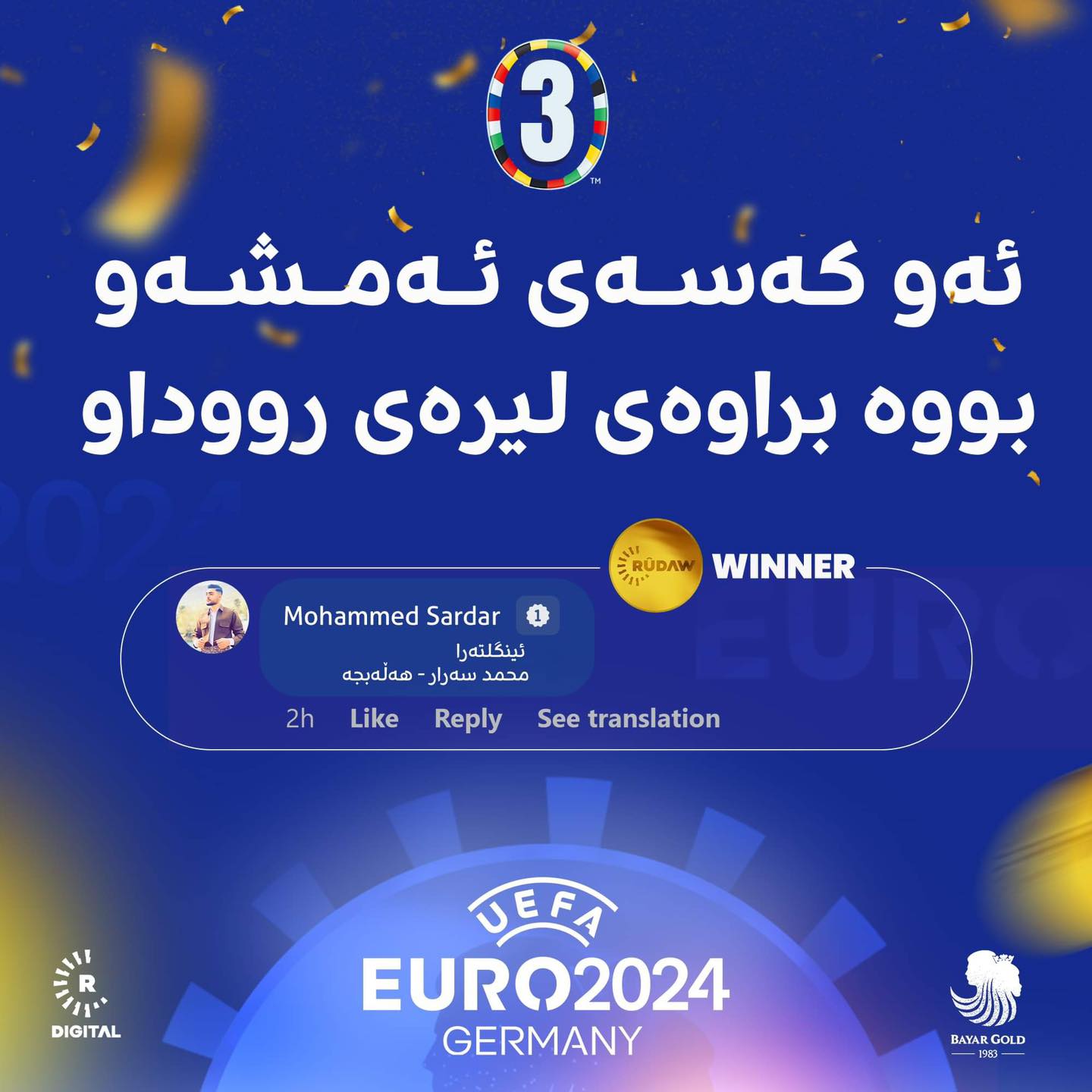 کاژێر 19:00 رێبوار محەممەد، سامان وڵاتژێری و کامەران نەسرەدین بە لایڤ لە پەیجی رووداو سپۆرت شرۆڤەی هەردوو یاریی یەکەمیان کرد و بەشداربووان بە کۆمێنت پێشبینییان بۆ ئەنجامی یاریی نێوان ئینگلتەرا و سڕبیا کرد و دواتر لە بەرنامەی یۆرۆی 2024 تیروپشک بۆ براوەکە راکێشرا و محەممەد سەردار، کە خەڵکی هەڵەبجەی شەهید بوو، بووە براوەی لیرەیەکی زێڕ کە بە "لیرەی رووداو" ناسراوە.