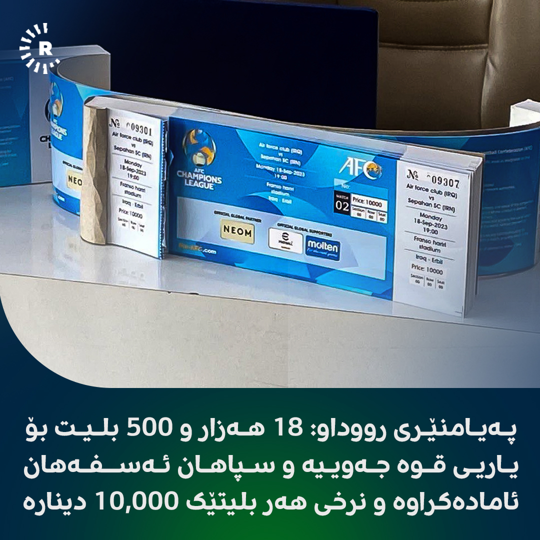 پەیامنێری رووداو لە هەولێر رایگەیاند، بۆ یارییەکەی ئەمڕۆ 18 هەزار و 500 بلیت ئامادەکراون و نرخی هەر بلیتێک 10 هەزار دینارە.