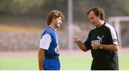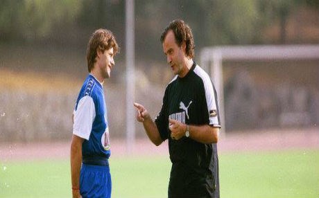 وێنەى مارسێلۆ بێلسا لەکاتى راهێنان بە یاریزانانى هەڵبژژاردەى ئەرژەنتبن، کە ئەوکات پۆچیتینۆ یەکێکبوو لە بەرگریکارە سەرەکییەکانى هەڵبژاردەکە