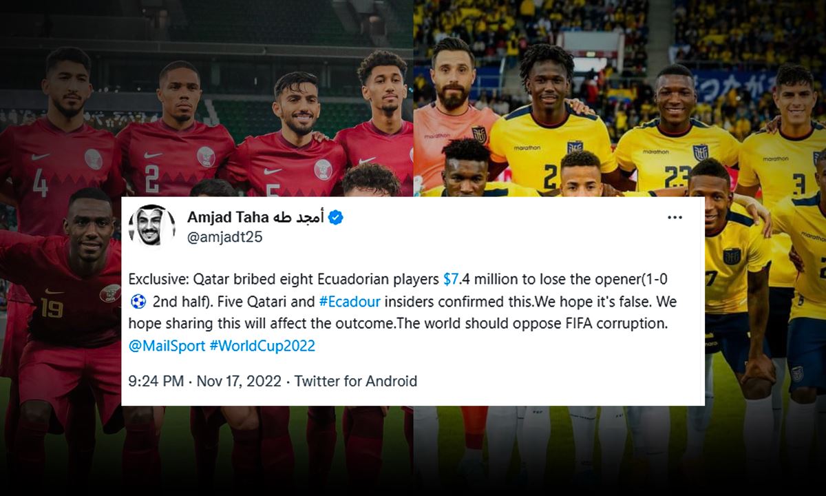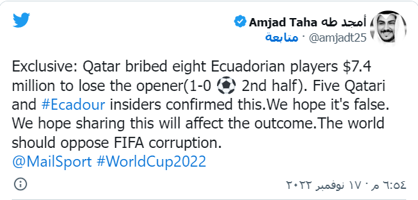 مارکا پشتی بە تویتێکی ئەمجەد تەها، شارەزای کاروباری سیاسی ستراتیژی و بەڕێوەبەری ناوچەیی ناوەندیی بەریتانیا لە سعودیە بەستووە، کە لە هەژماری فەرمی خۆی لە تۆڕی کۆمەڵایەتی تویتەر بڵاویکردووەتەوە، قەتەر پێشنیازی بەرتیلدانی بە 8 یاریزانی هەڵبژاردەی ئیکوادۆری کردووە، کە بەهای 7.4 ملیۆن دۆلارە، بۆ ئەوەی هەڵبژاردەی ئیکوادۆر بەرامبەر قەتەر، بە گۆڵێک بەرامبەر بە هیچ بدۆڕێت.