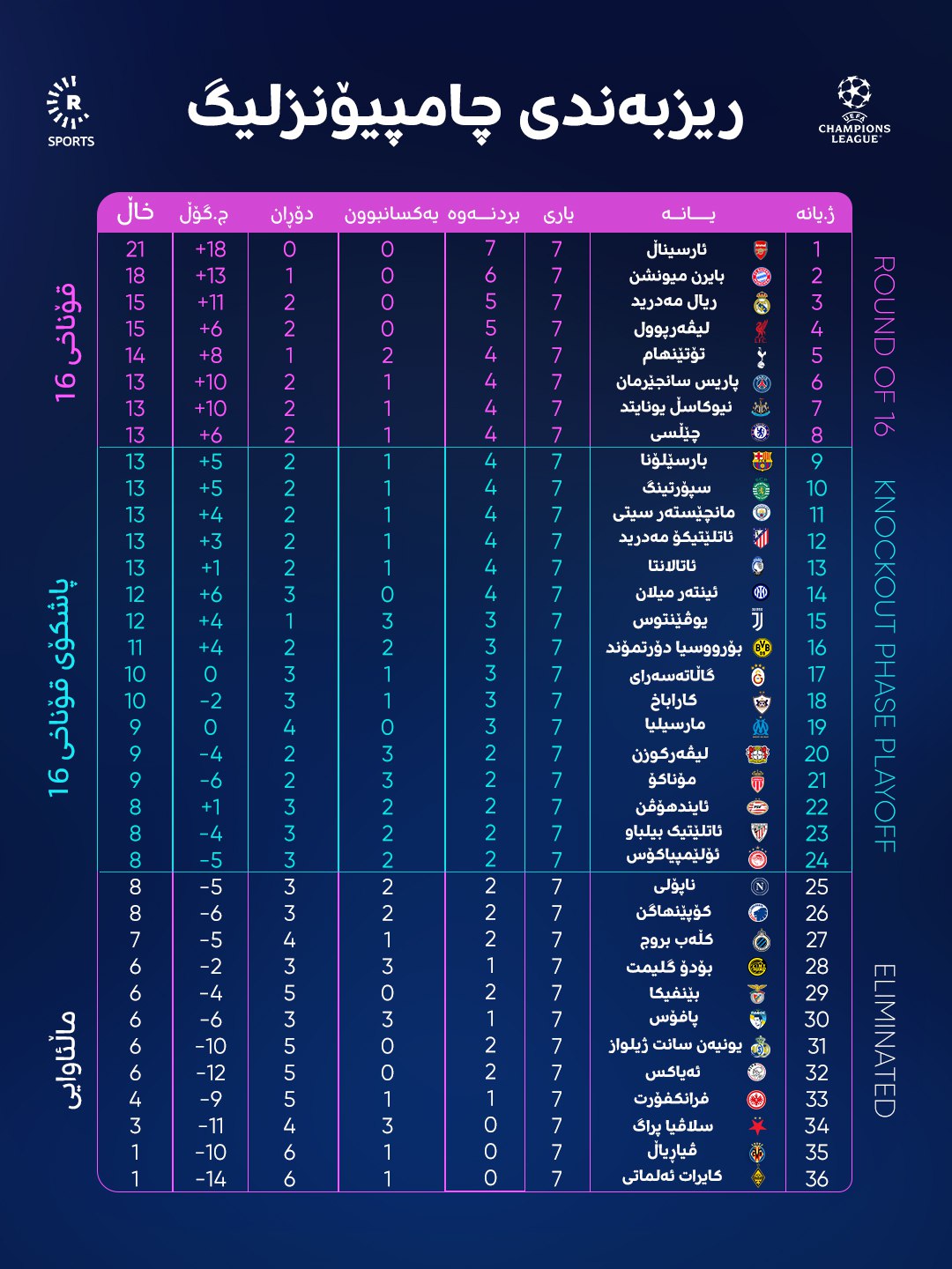 نوێترین ریزبەندی قۆناخی خولی چامپیۆنزلیگ: