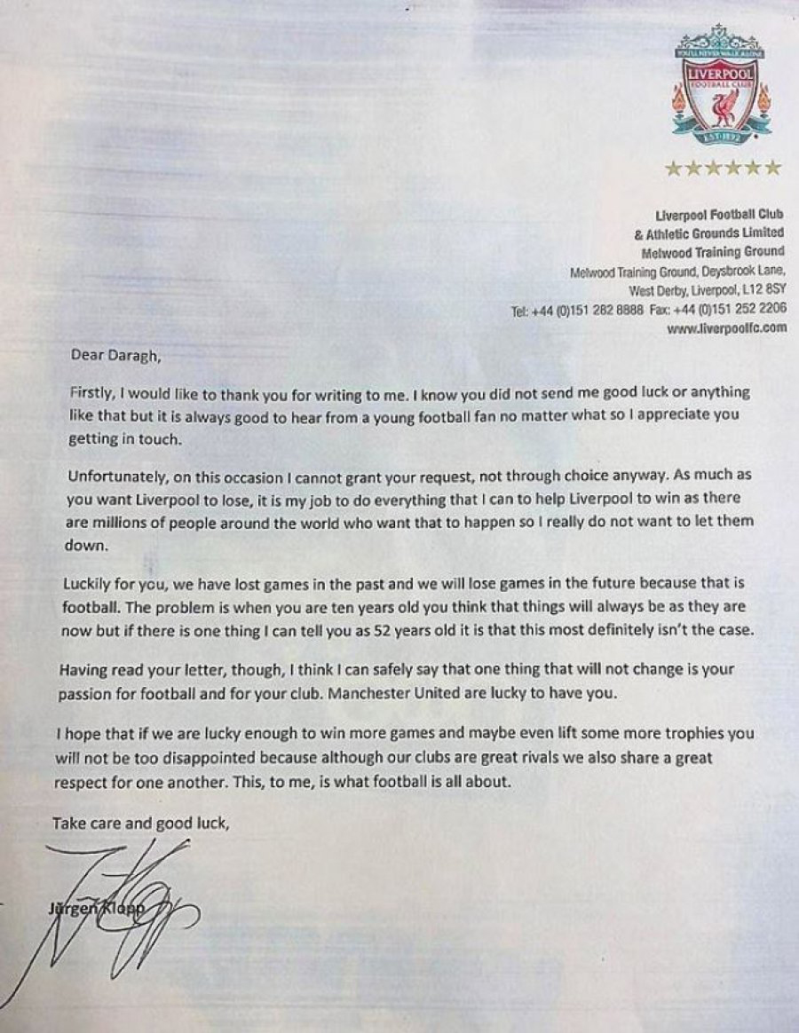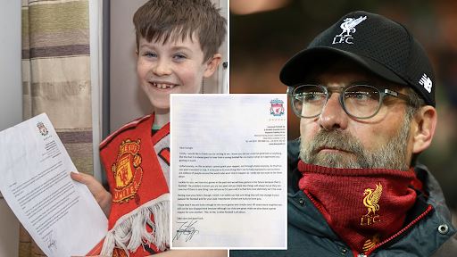 لە نامەیەکی زۆر سەرنجڕاکێشدا، منداڵێکی 10 ساڵ کە هاندەری یانەی مانچێستەر یونایتدی ئینگلیزییە، نامەیەک بۆ یورگن کڵۆپ، راهێنەری یانەی لیڤەرپوول دەنێرێت و داوای لێدەکات خۆی بە یانەیەک بدۆڕێنێت.