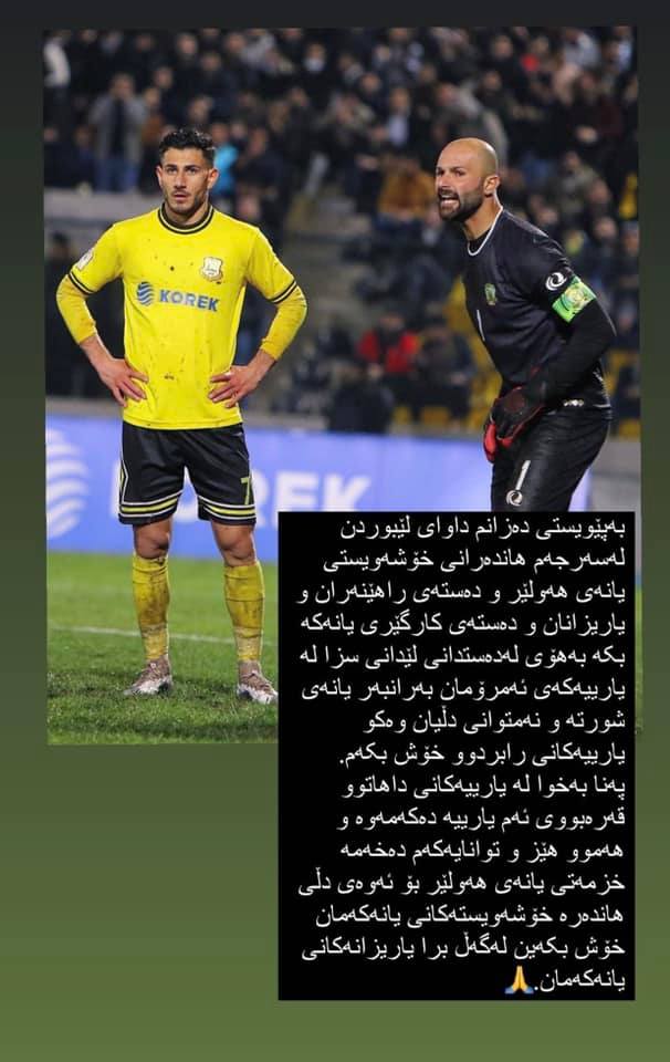 شێرکۆ کەریم لە پۆستێکدا لە فەیسبووکی خۆی نووسیوویەتی " بەپێویستی دەزانم داوای لێبوردن لە هاندەرانی خۆشەویستی یانەی هەولێر، دەستەی راهێنەران، یاریزانان و دەستەی کارگێری یانەکە بکەم، بەهۆی لەدەستدانی لێدانی سزا لە یارییەکەی بەرامبەر یانەی شورتە."