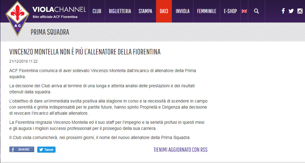 یانەی فیۆرێنتینا، لەسەر ماڵپەری فەرمی خۆی دوورخستنەوەی ئەو راهێنەرەی لە پۆستەکەی راگەیاند و نووسیوویەتی، بەهۆی ئاستی خراپی یانەکە و ئەنجامەکانی بڕیاری دوورخستنەوەی راهێنەرەکەیان داوە.