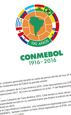 ههر ئهمڕۆ شهممه ، ئەلیخاندرۆ دۆمینگێز، سەرۆکی فيدراسيؤنى تۆپی پێی ئەمریکای باشوور ناسراو بە کۆنمیپۆل ئاشكرایكرد ،پاڵەوانی کۆپا ئەمێریکای 2016 بەفەرمی دانی پێدادەنرێت، بەڵام بەشداری لە جامی کیشوەرەکانی 2017 ناکات و هەڵبژاردەی چیلی پاڵەوانی 2015 بەشداری دەکات