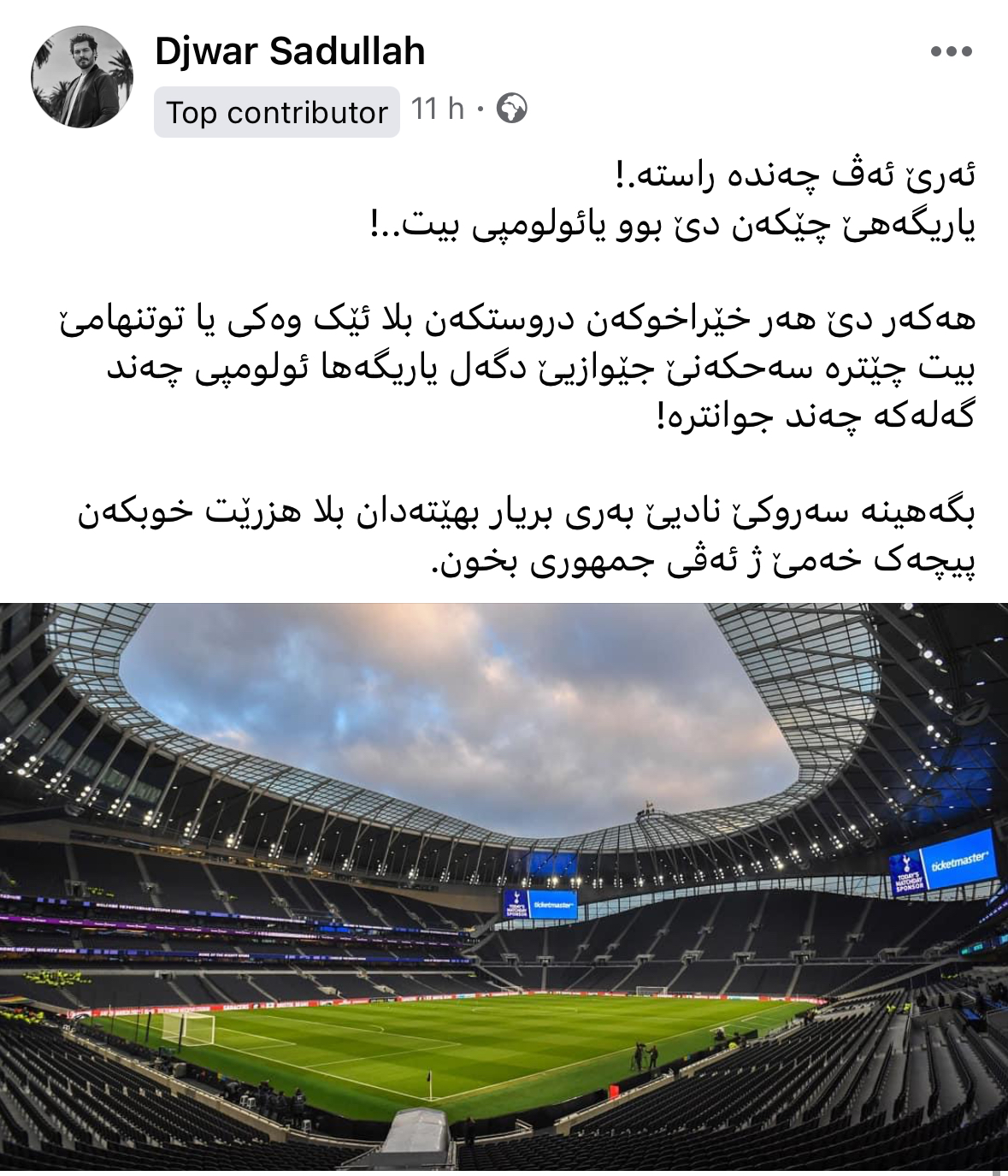 عەبدوڵڵا جەلال لەو بارەیەوە زیاتر گوتی "یاریگەکە ئۆڵیمپی دەبێت و بەشێوەیەکی سەردەمیانە دروستدەکرێت و شوێنەکەشی دەکەوێتە ئێتیت و لە ماوەی داهاتوودا گفتوگۆ لەبارەی شێوازی جێبەجێکردنی پڕۆژەکەوە دەکرێت."