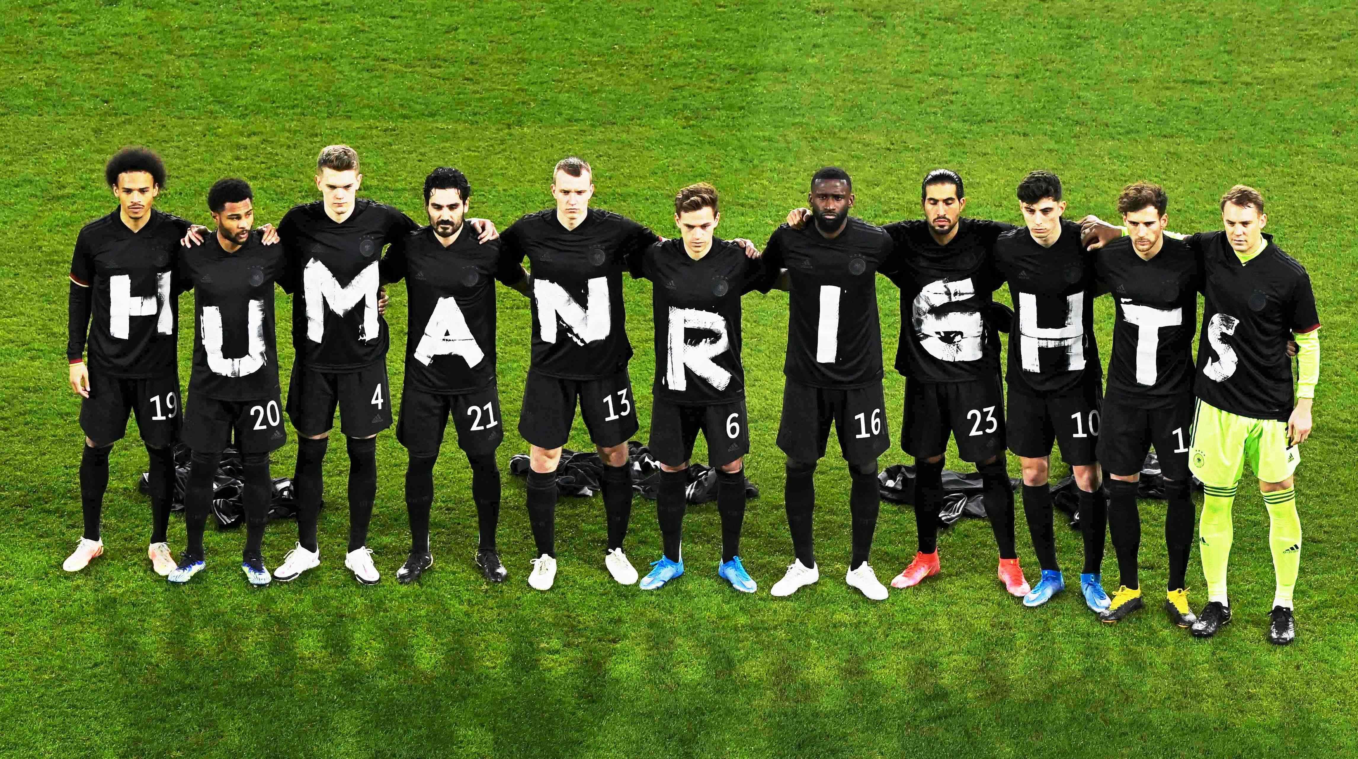 یاریزانانی ئەڵمانیا پێش دەستپێکردنی یارییەکەیان بەرامبەر ئایسلەندا لە گەڕی یەکەمی پاڵاوتنەکاندا، وشەی "مافی مرۆڤ"ـیان لەسەر درێسەکانیان نووسیبوو.
