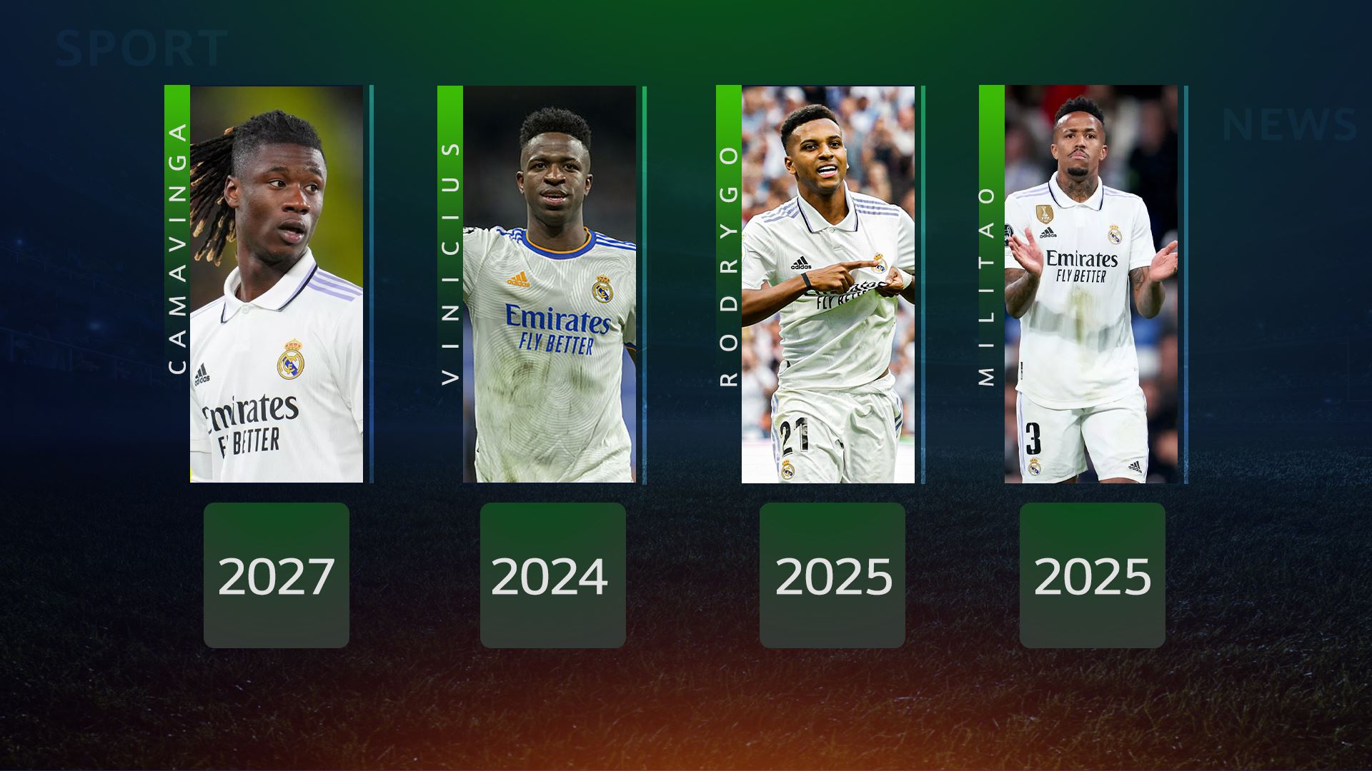 کارگێریی ریال مەدرید ئامادەکاری دەکات، بۆ ئەوەی لە داهاتوویەکی نزیکدا گرێبەستی هەریەکە لە ڤینیسیۆس جونیۆر، رۆدریگۆ گوس، ئیدوارد کاماڤینگا و ئیدێر میلتاو نوێبکاتەوە.