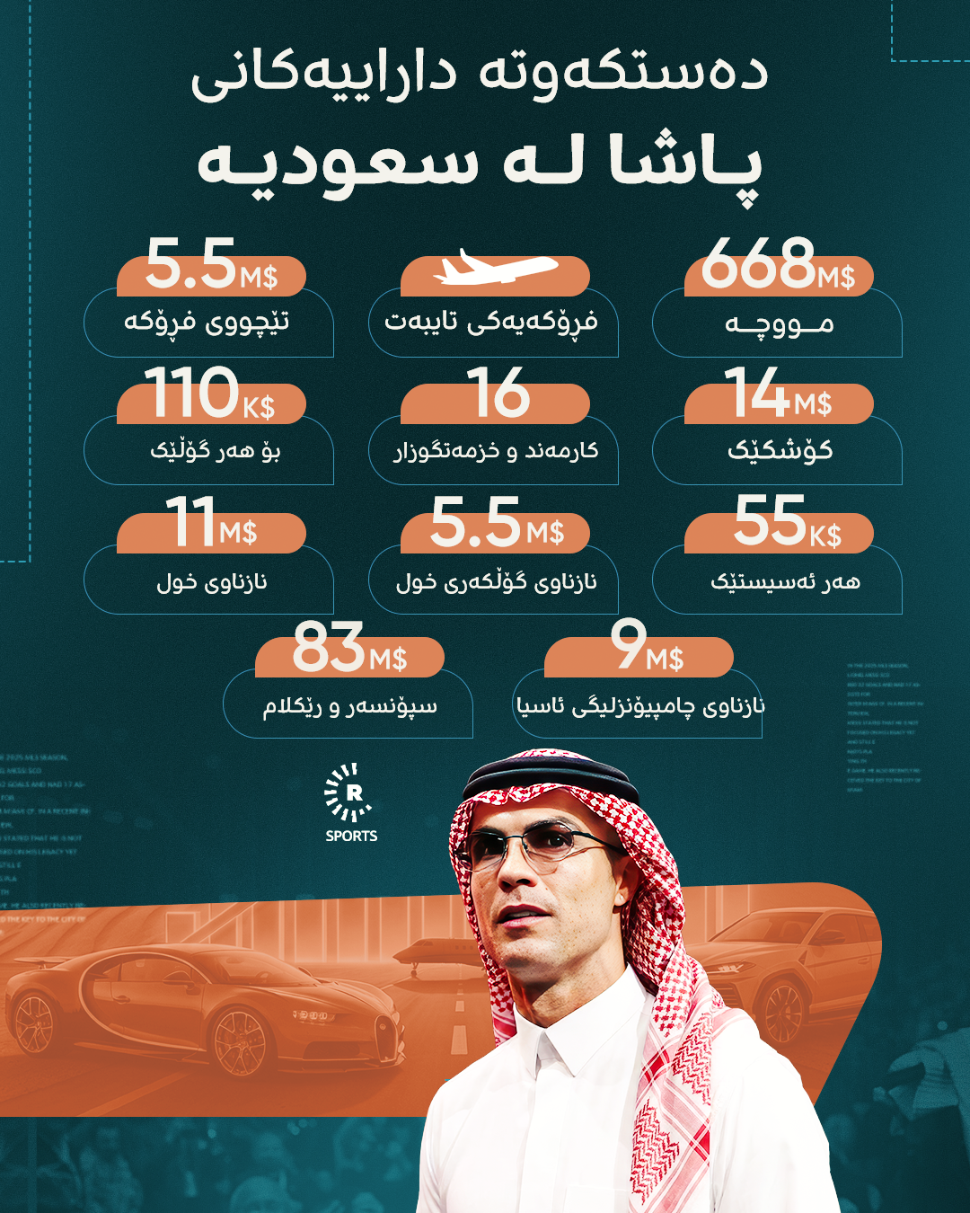 بێجگە لە هەموو ئەمانە، کاپتنی هەڵبژاردەی پۆرتوگال و یانەی نەسڕ بڕی 83 ملیۆن دۆلار لە گرێبەستی سپۆنسەر و رێکلامکردن بەدەستدێنێت. هەروەها 15٪ـی خاوەندارێتی یانەی نەسڕی بە بەهای نزیکەی 45 ملیۆن دۆلار بەدەستهێناوە.
