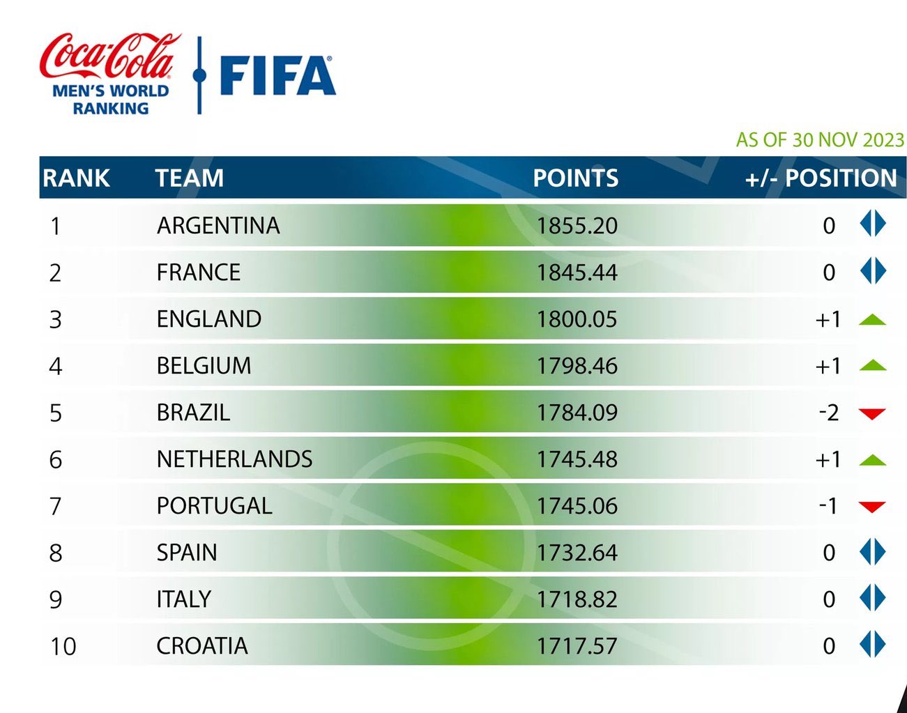 هەڵبژاردەی ئینگلتەرا پلەی سێیەمی گرتووە، بەلجیکا لە پلەی چوارەمە، هەڵبژاردەی بەرازیل دوو پلە دابەزیووە و ئێستا لە پلەی پێنجەمی باشترین هەڵبژاردەکانی جیهانە.
