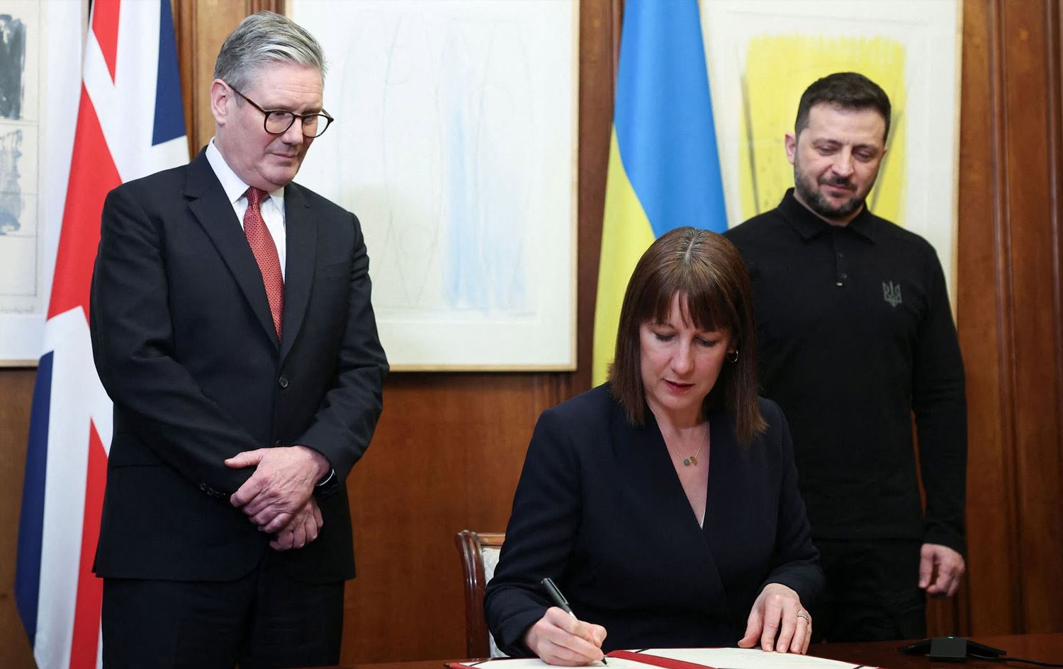 رەیچڵ ریڤز، وەزیری دارایی بەریتانیا بە ئامادەبوونی کیەر ستامەر، سەرۆکوەزیرانی بەریتانیا و ڤۆلۆدیمیر زیلینسکی، سەرۆکی ئۆکراینا هەروەها، سێرگی مارچێنکۆ، وەزیری دارایی ئۆکراینا کە بەشێوەی ڤێرچوەڵ ئامادەبوو، واژۆی لەسەر رێککەوتنەکە کرد.