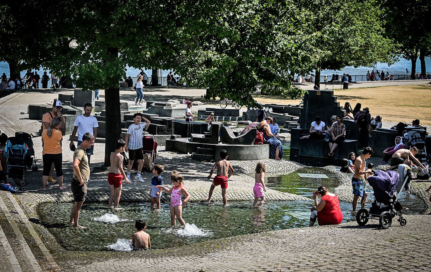 چەند منداڵێک لە بەرلین چوونەتە نێو نافورەیەک و خۆیان فێنک دەکەنەوە. وێنە: Sascha Steinbach/EPA-EFE/Shutterstock
