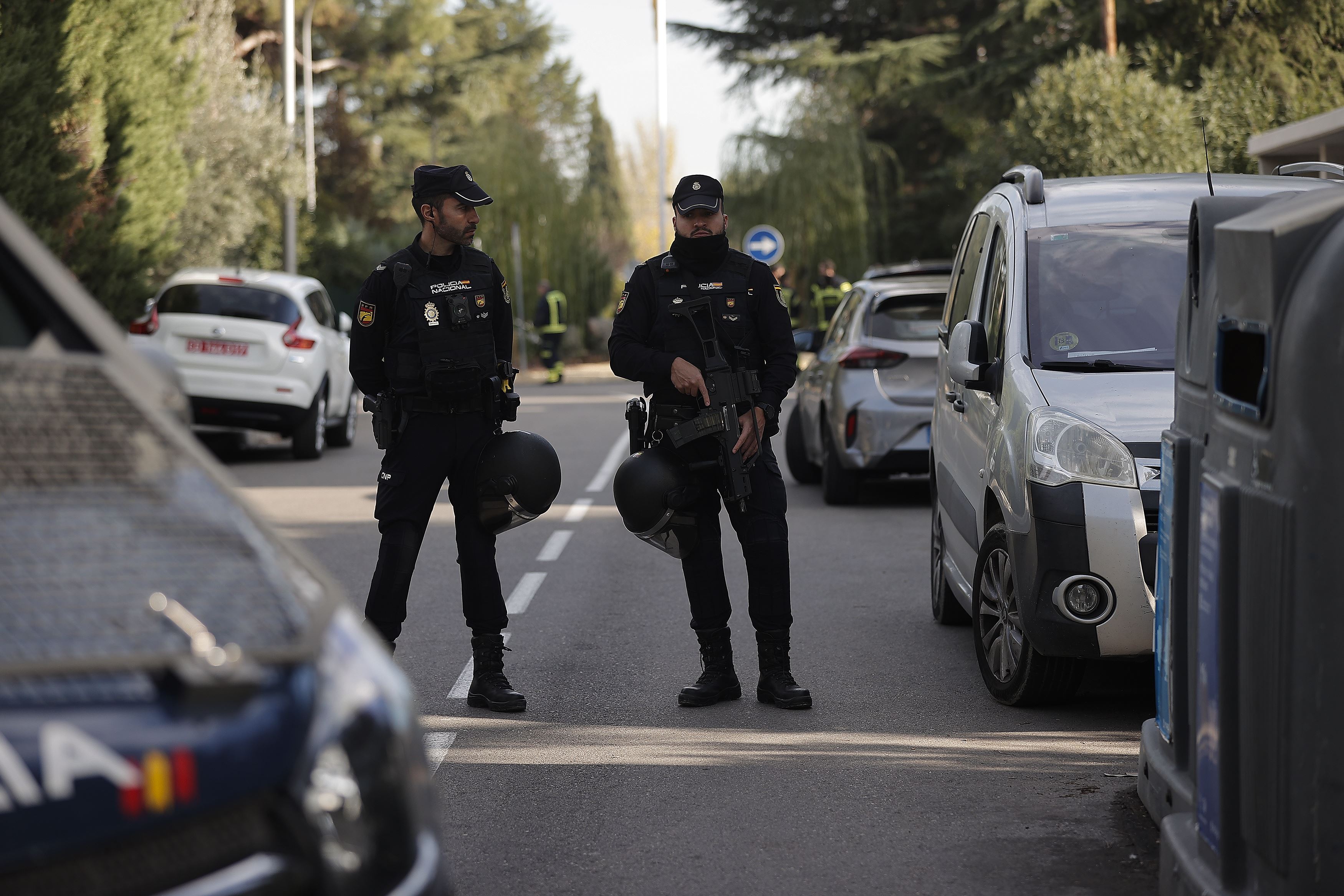 دوو پۆلیسی ئیسپانی لەبەردەم باڵیۆزخانەی ئۆکراینا لە مەدرید دوای ئەوەی تەقینەوەیەک لەوێ روویدا. وێنە: AA