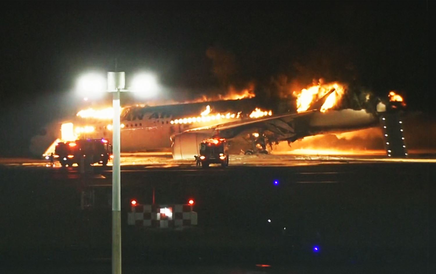 فڕۆکەیەکی هێڵی ئاسمانیی ژاپۆن لە فڕۆکەخانەی هانیدا لە تۆکیۆ ئاگریگرتووە.