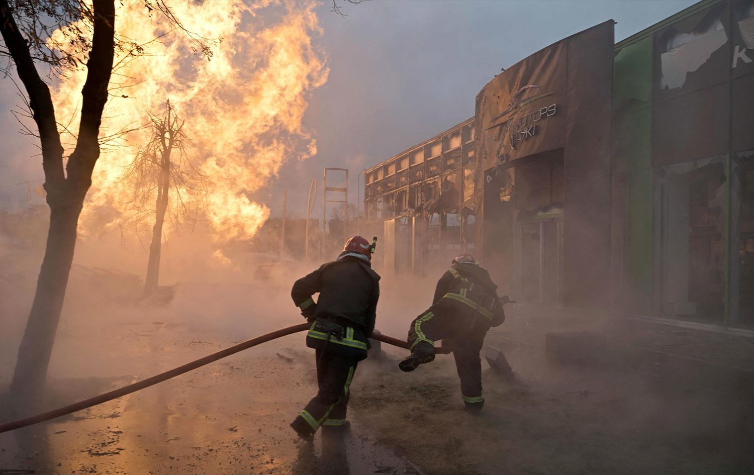 تیمێکی ئاگرکوژێنەوە لە کیێڤ ئاگری باڵەخانەیەک دەکوژێننەوە کە بەهۆی بۆردوومانی رووسیاوە کەوتووەتەوە. وێنە: Genya SAVILOV / AFP