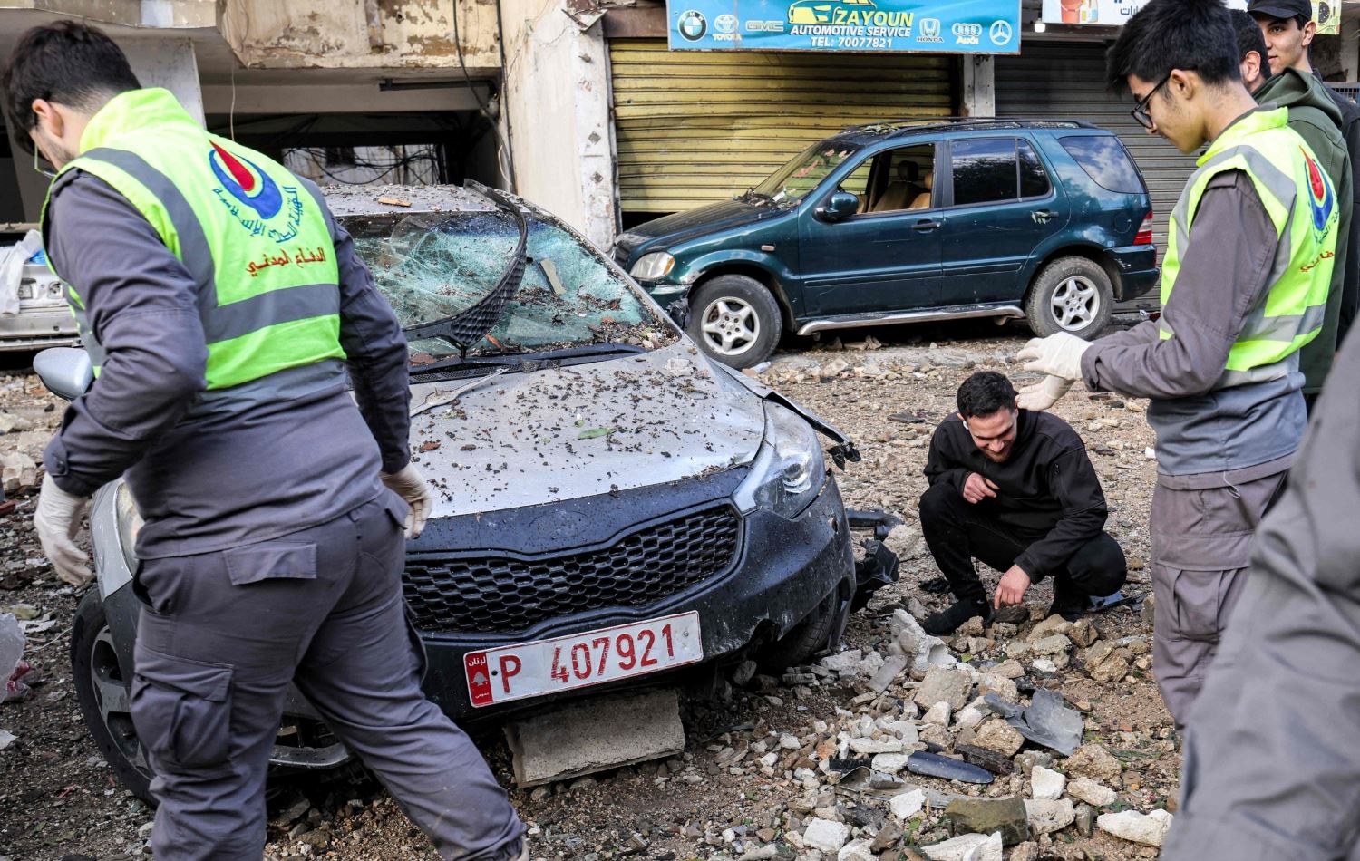 کارمەندانی بەرگریی شارستانیی لوبنان لەکاتی پشکنینی ئۆتۆمبێلێک لەدوای تەقینەوەی ئەو شوقەیەی، قارووریی تێدا کوژرا، وێنە: ANWAR AMRO / AFP