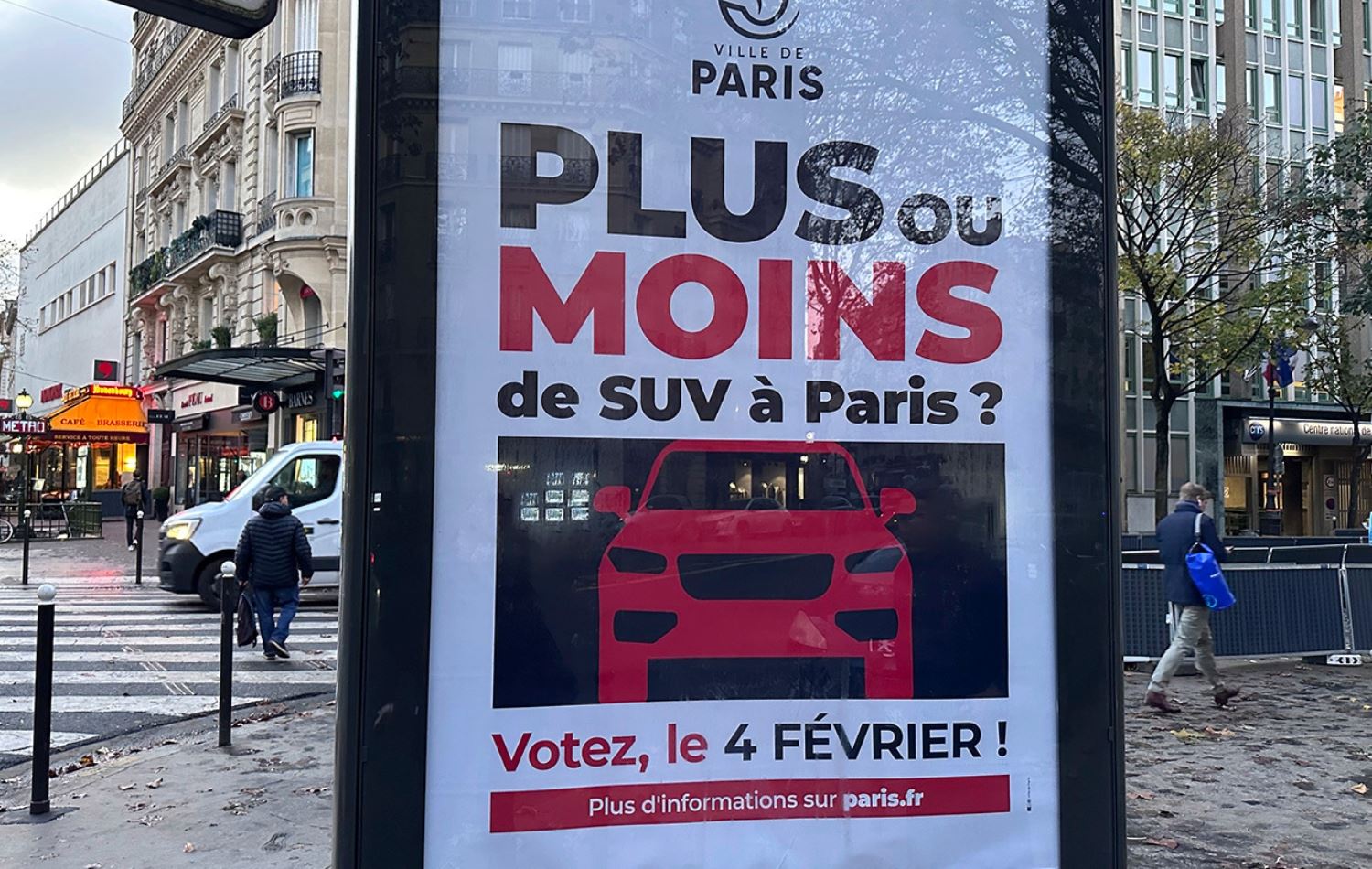 لەسەر شاشەی شەقامێکی پاریس بانگەشە دەکرێت بۆ دەنگدان لە گشتپرسییەکە، تێیدا نووسراوە: 4ـی شوبات دەنگ بدە بۆ ئەوەی ئۆتۆمبێلی SUV زیاتر یان کەمتر بێت لە پاریس