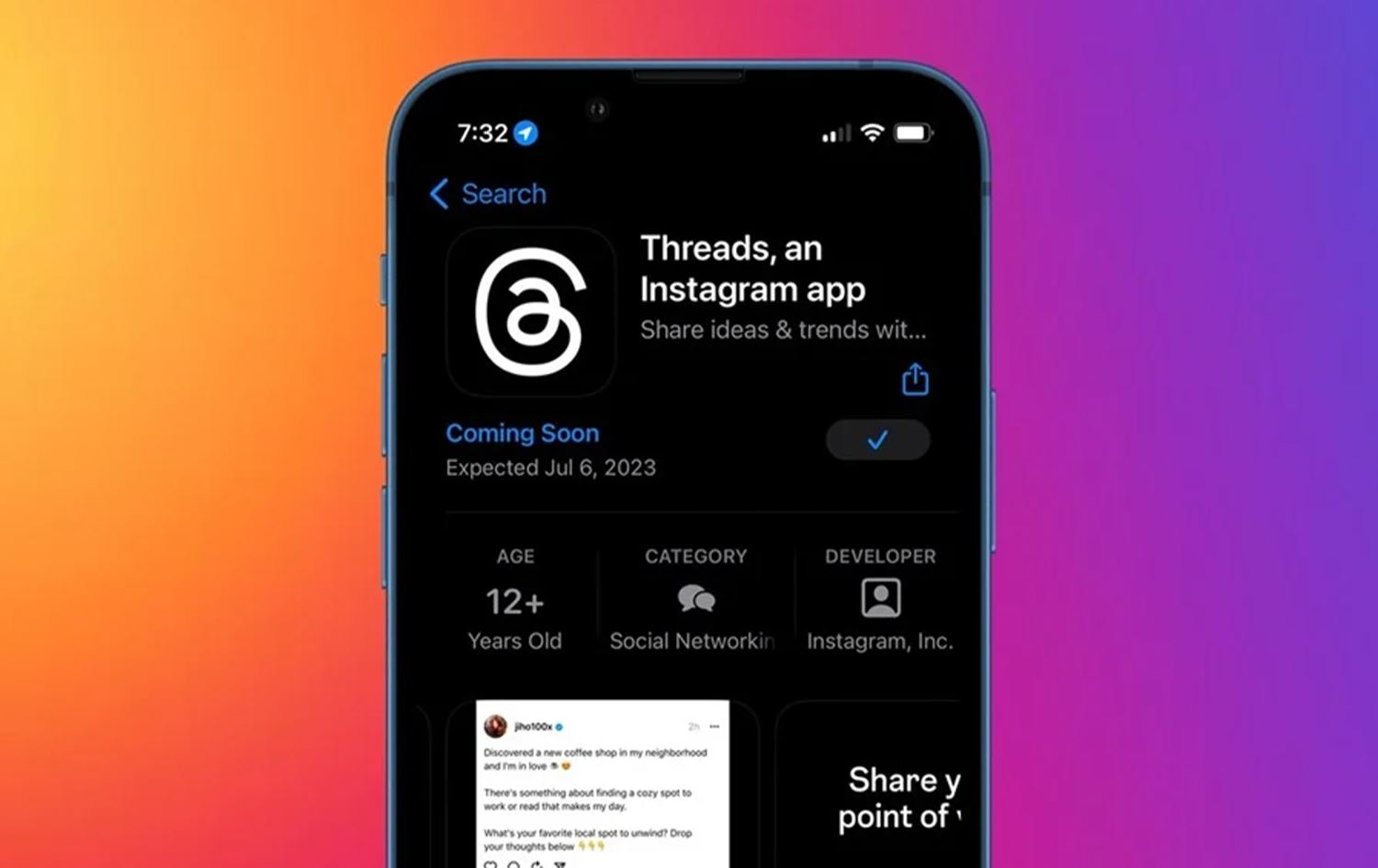 ئەپەکە بە ناوی ئینگلیزیی "Threads, an Instagram app," لە ئەپستۆر خراوەتەڕوو، لە وردەکارییەکانیدا ئاماژە بەوە کراوە کە لە چەند رۆژێکی کەمی داهاتوودا بۆ دابەزاندن بەردەستدەبێت.