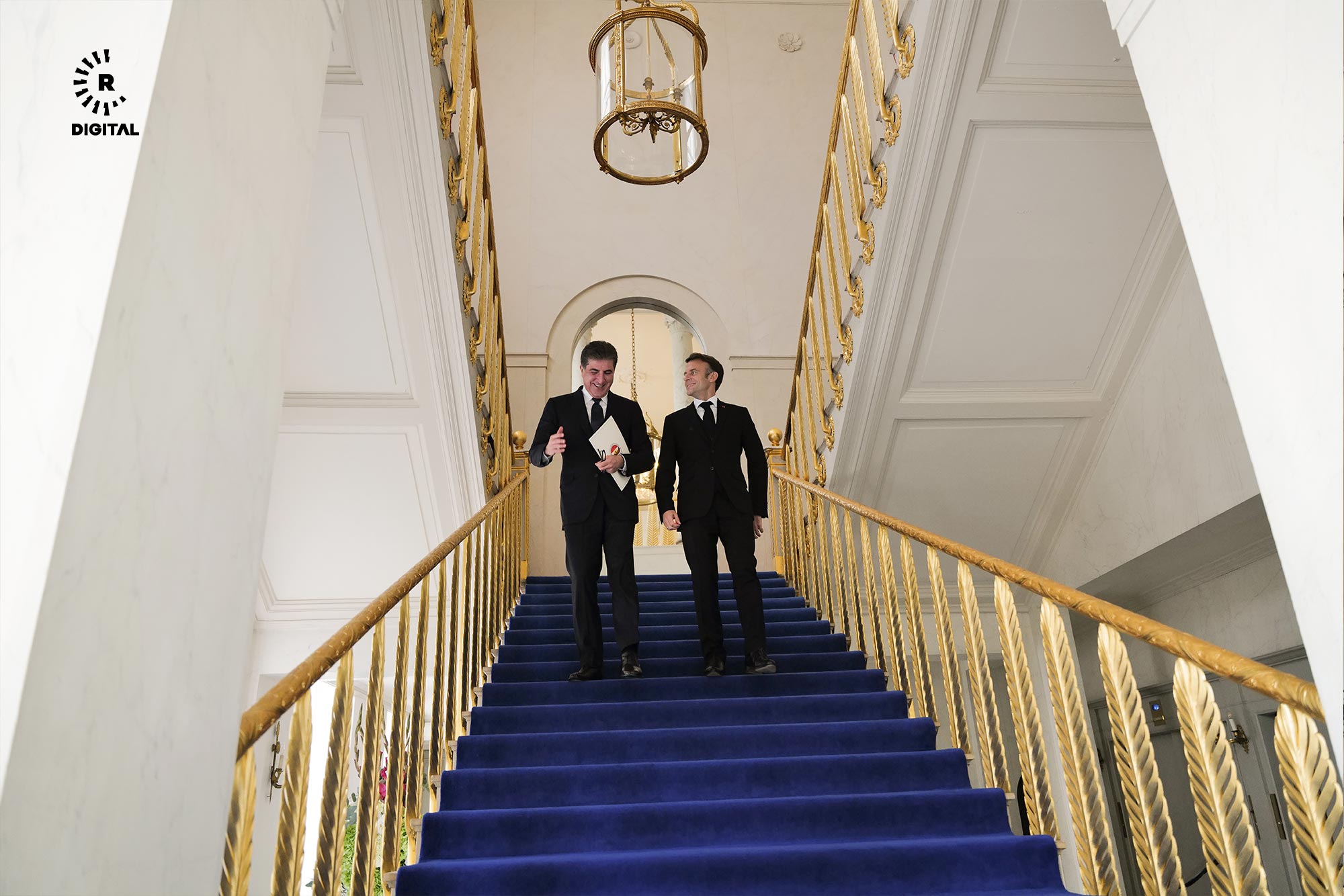 ئیمانوێل ماکرۆن، سەرۆککۆماری فەرەنسا و نێچیرڤان بارزانی، سەرۆکی هەرێمی کوردستان کە یەکدی بە "هاوڕێی ئازیز" بانگ دەکەن، رۆژی هەینی (3-11-2023) بۆ ماوەی کاژێرێک کۆبوونەوە.