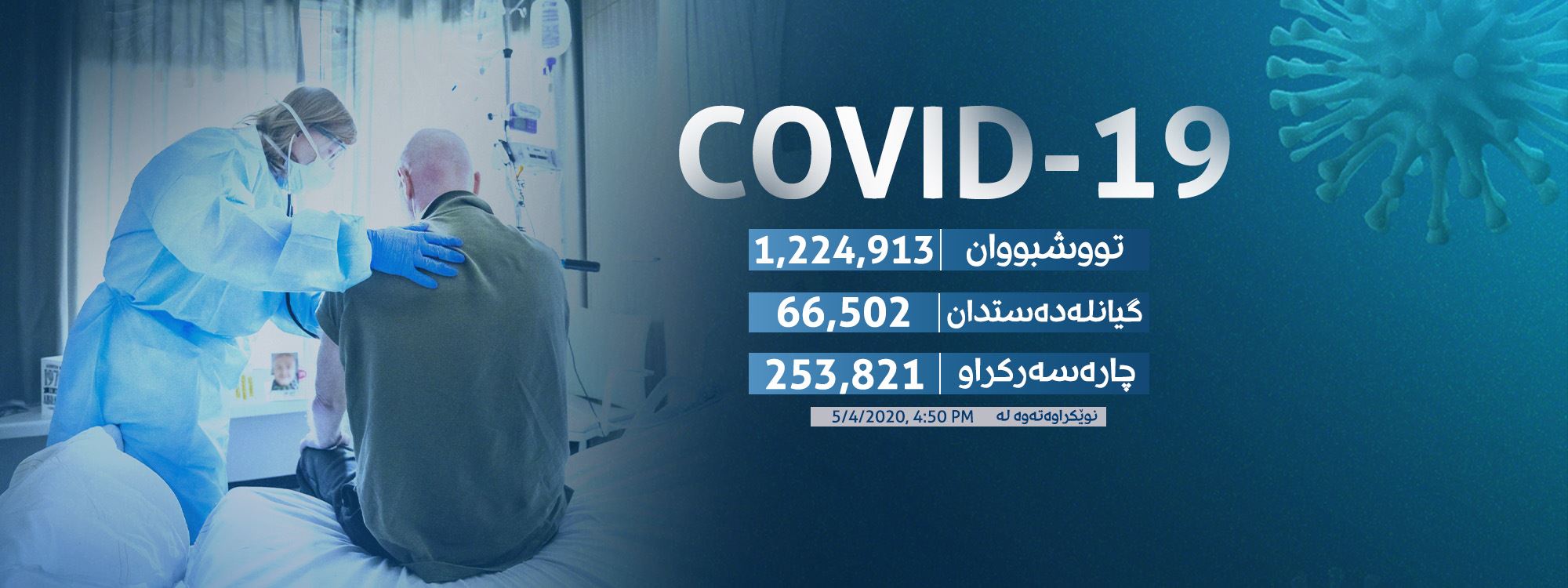 لە 190 وڵات و هەرێمی سەرانسەری جیهاندا ژمارەی مردووان بە ڤایرۆسی کۆرۆنای نوێ (کۆڤید-19) 65 هەزار و 800 کەسی تێپەڕاند.