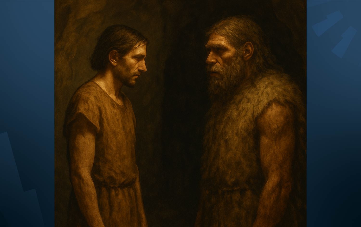 ئەم وێنەیە بە ژیریی دەستکرد دروستکراوە کە لای راستەوە مرۆڤی نیاندەرتاڵ و لای چەپەوە مرۆڤی مۆدێرن دەردەخات.