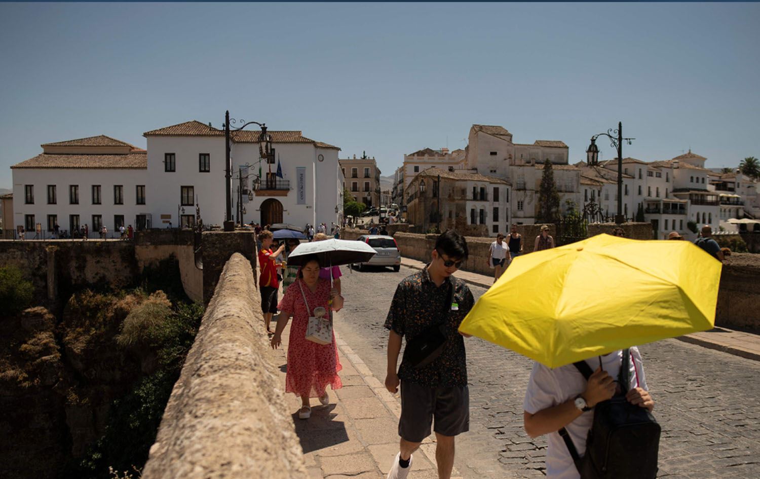 گەشتیاران لەڕێگەی چەترەوە هەوڵدەدەن کاریگەریی گەرما لەسەریان کەمبکەنەوە لە 9ـی ئابی 2024، باشووری ئیسپانیا، وێنە: JORGE GUERRERO / AFP