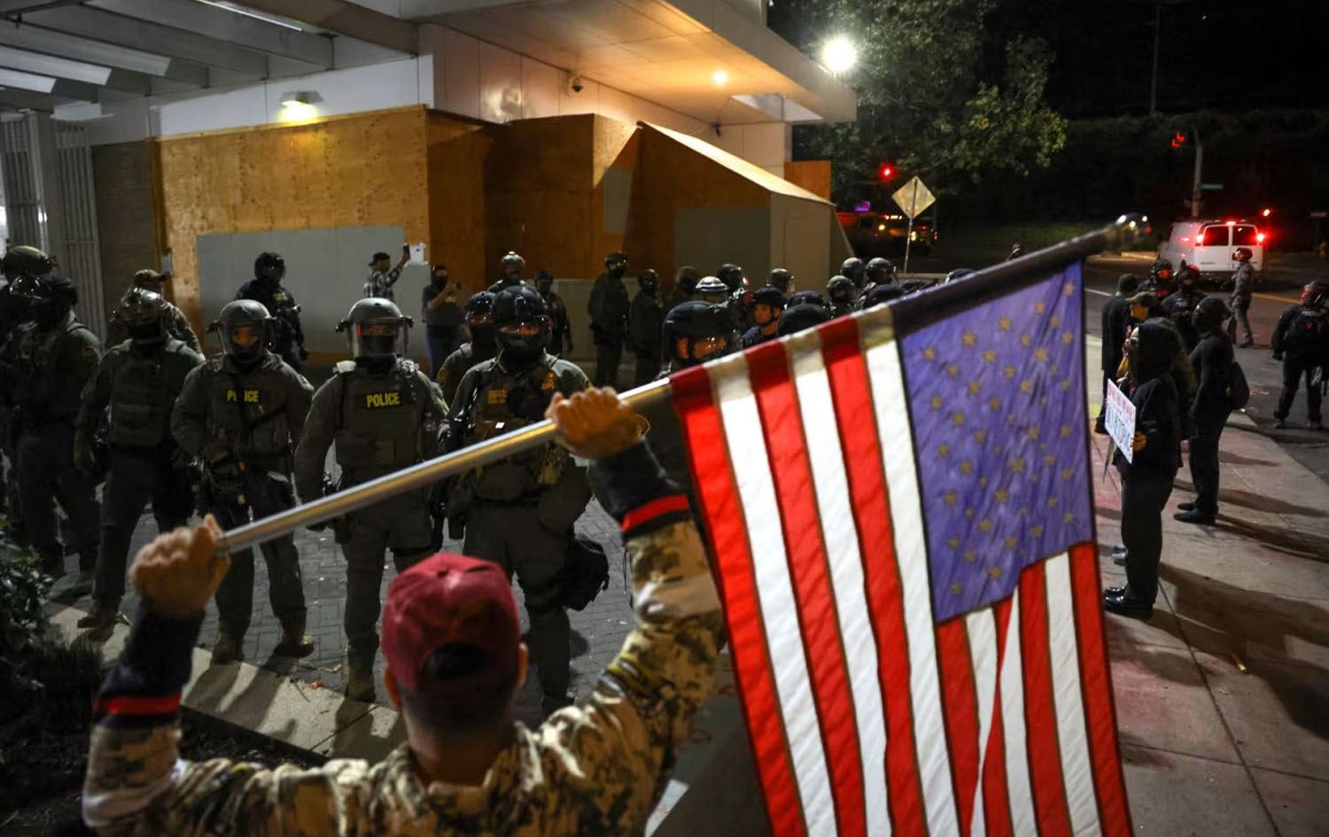 پیاوێک ئاڵای ئەمریکای بەڕووی هێزە ئەمنییەکانی ئەمریکادا بەرزکردووەتەوە. وێنە: Carlos Barria/ Reuters