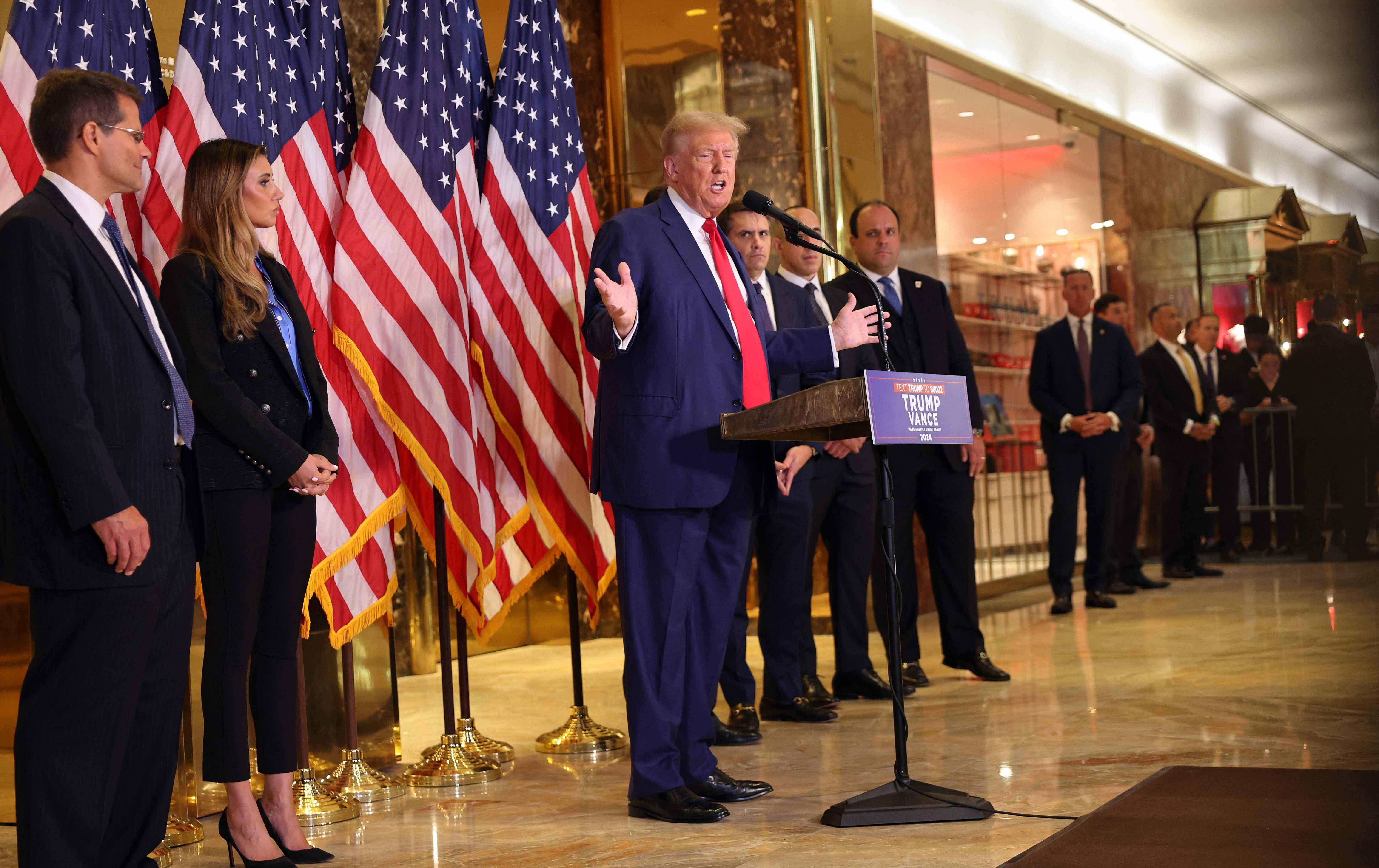 دۆناڵد ترەمپ دوای بڕیارەکە قسە دەکات. وێنە: Michael M. Santiago / GETTY IMAGES NORTH AMERICA / AFP