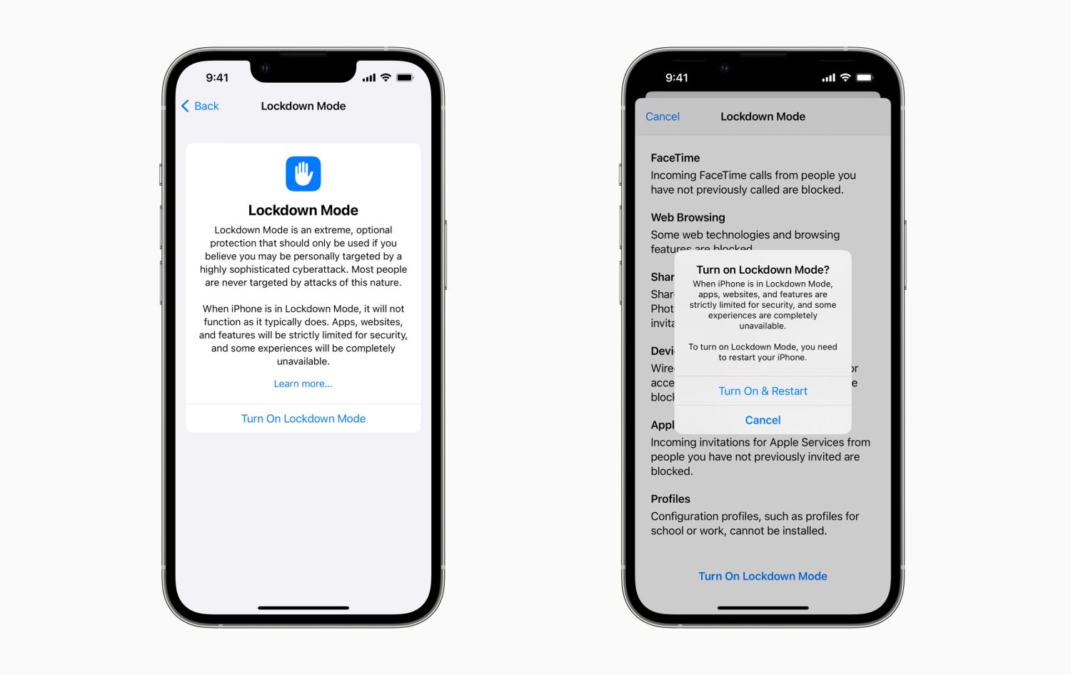 رۆژی چوارشەممە 06-07-2022 کۆمپانیای ئەپڵ رایگەیاند، بۆئەوەی بەکارهێنەرانی ئایفۆن سەلامەت بن لە هاککردن و کاری سیخوڕی بەسەریانەوە، خزمەتگوزارییەکی ئەمنی بەناوی "لۆکداون مۆد - دۆخی کەرەنتین" رادەگەیێنێت. بەپێی راگەیێندراوی کۆمپانیاکەش، بەمزووانە ڤێرژنێکی بۆ تاقیکردنەوە کارا دەکات.